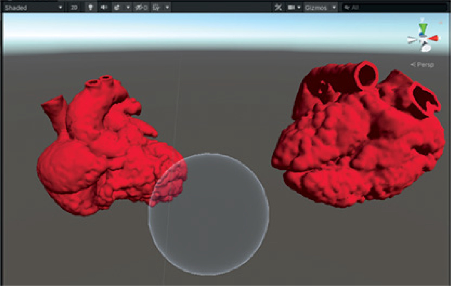 Understanding the complex anatomy and morphology of congenital heart disease requires spatial orientation and perception. Brun et al. compared the experience and retention of knowledge of students who were taught the anatomy of congenital heart defects using 3D printed models, mixed reality visualization, and 2D CT angiography images. Students performed better with the holographic visualization model [32]. In a similar study, Lau et al. from the University of Perth, Australia, recruited 34 cardiologists to evaluate 3D and mixed reality models of cardiac chambers with congenital heart disease for optimal anatomical and morphological learning and preoperative planning [33]. Starting from standard DICOM images and creating mixed reality renderings, the digital heart models were transferred to the Blender Foundation, Amsterdam, the Netherlands, for optimization of holographic rendering. The Blender Foundation is an independent non-profit organization that aims to provide complete and free 3D creation applications. The Mixed Reality application was developed with the help of the Unity engine, a real-time 3D development engine that allows artists, designers, and programmers to collaborate on Windows, Mac, and Linux programs to create stunning immersive and interactive experiences. From the Unity application, the two optimized models were loaded onto the screen. The intense color of the models gives a more realistic appearance. A sphere was then added as a segmentation tool to the models to visualize the internal cavities. Figure 2 shows two-colored heart models and the sphere (Figure 2).