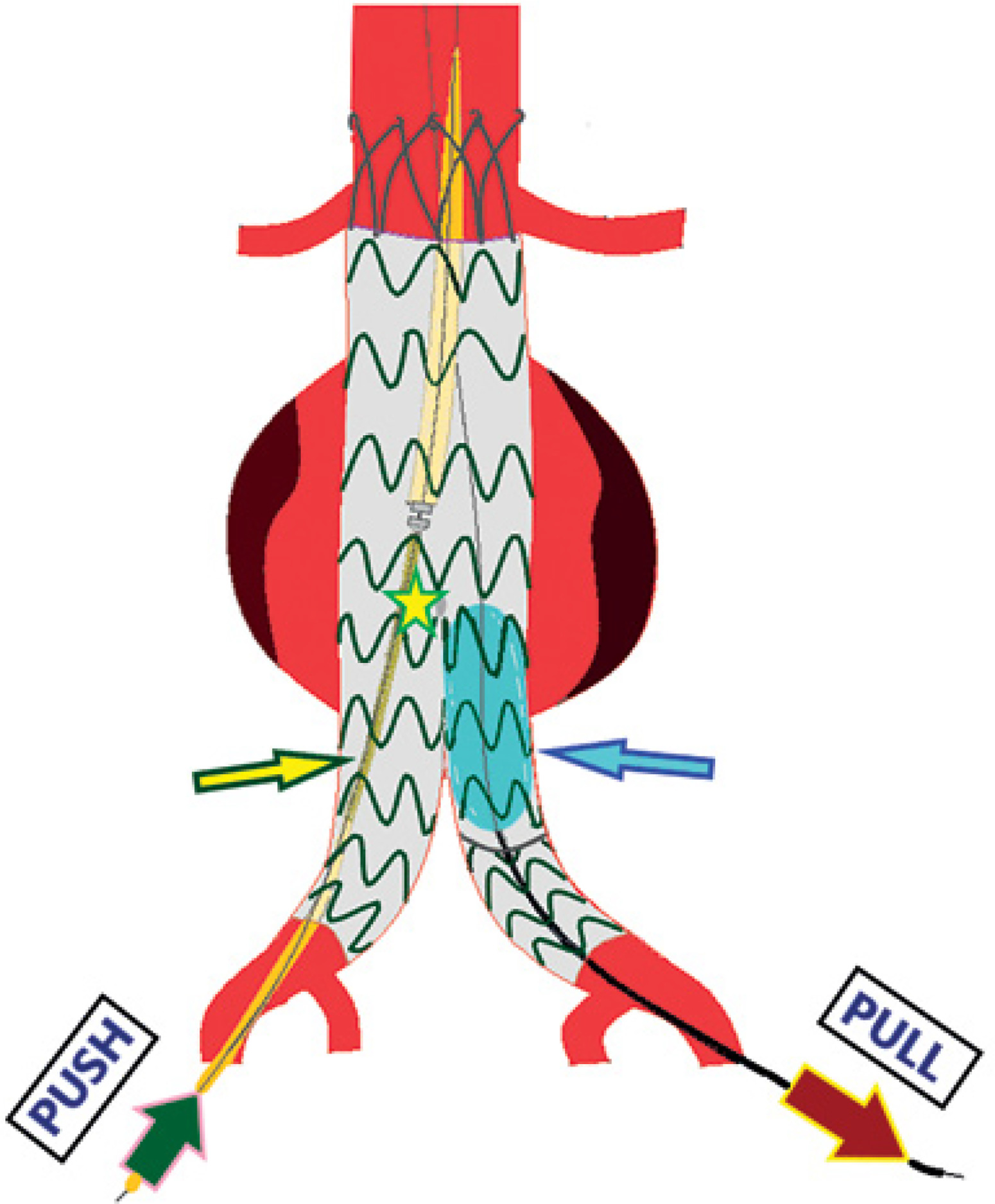 An endograft with a suprarenal stent was placed in a patient with a 5 cm-sized abdominal aortic aneurysm. The anatomy was favorable and within the instructions for use of the graft. After deployment of the main body and placement of the contralateral limb, an inability to retract the delivery system was realized (green-yellow arrow). It seemed that the delivery system was blocked at the flow divider level for unknown reasons (green-yellow star). This issue occurred despite favorable anatomy and within the instructions for use of the graft. While the problem was encountered with this specific device, similar issues have been reported with other endografts. Factors such as iliac tortuosity, small aortic diameter, or increased friction at the flow divider level may contribute to such complications by hindering smooth retraction of the delivery system. Attempts to release it by forward and backwards movements were futile and as they were pushing the whole graft up and down, they resulted in endograft distal migration. The problem was solved after the insertion of a molding balloon at the contralateral side, just distally to the flow divider level. It was inflated enough to stabilize the main body (light blue arrow). Equal bidirectional forces were applied in the delivery system ipsilaterally (upward direction) and in the molding ballon contralaterally (backward direction). This bidirectional maneuver allowed for excessive force to be applied in both items without jeopardizing the stability of the whole graft. Excessive force achieved the upward release of the delivery system. Subsequently, it was easily retracted and removed. Afterwards, an aortic cuff was placed proximally to fix the initial endograft migration. The principle behind this bidirectional maneuver is that by simultaneously applying opposing forces – one stabilizing the graft distally with the molding balloon and the other releasing the delivery system proximally – the system can be disengaged without transmitting destabilizing forces to the main body of the endograft. This controlled force distribution minimizes the risk of graft displacement while effectively resolving the blockage. Imaging with computed tomography angiography on the 2nd postoperative day was normal, and the patient was discharged. Although early imaging was reassuring, mid- and long-term follow-up remains essential to ensure the durability of the repair. A follow-up CTA at 1 and 6 months was planned to assess for late migration, stent integrity, and overall endograft performance.