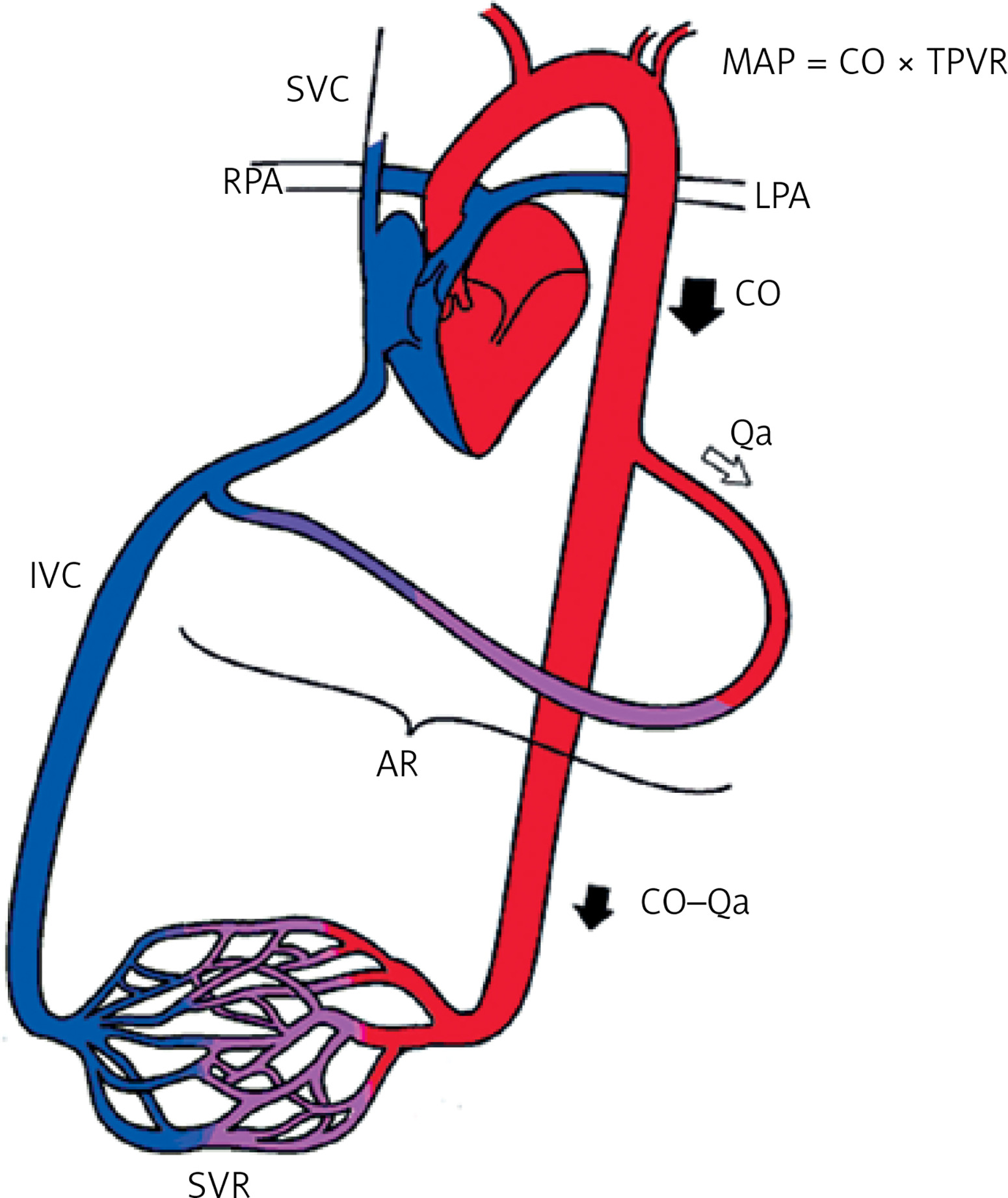 SVC – superior vena cava, LPA – left pulmonary artery, RPA – right pulmonary artery, IVC – inferior vena cava, MAP – mean arterial pressure, CO – cardiac output, Qa – AVF flow rate, AR – AVF resistance, SVR – systemic vascular resistance, TPVR – total peripheral vascular resistance (TPVR = PVR + AR).
