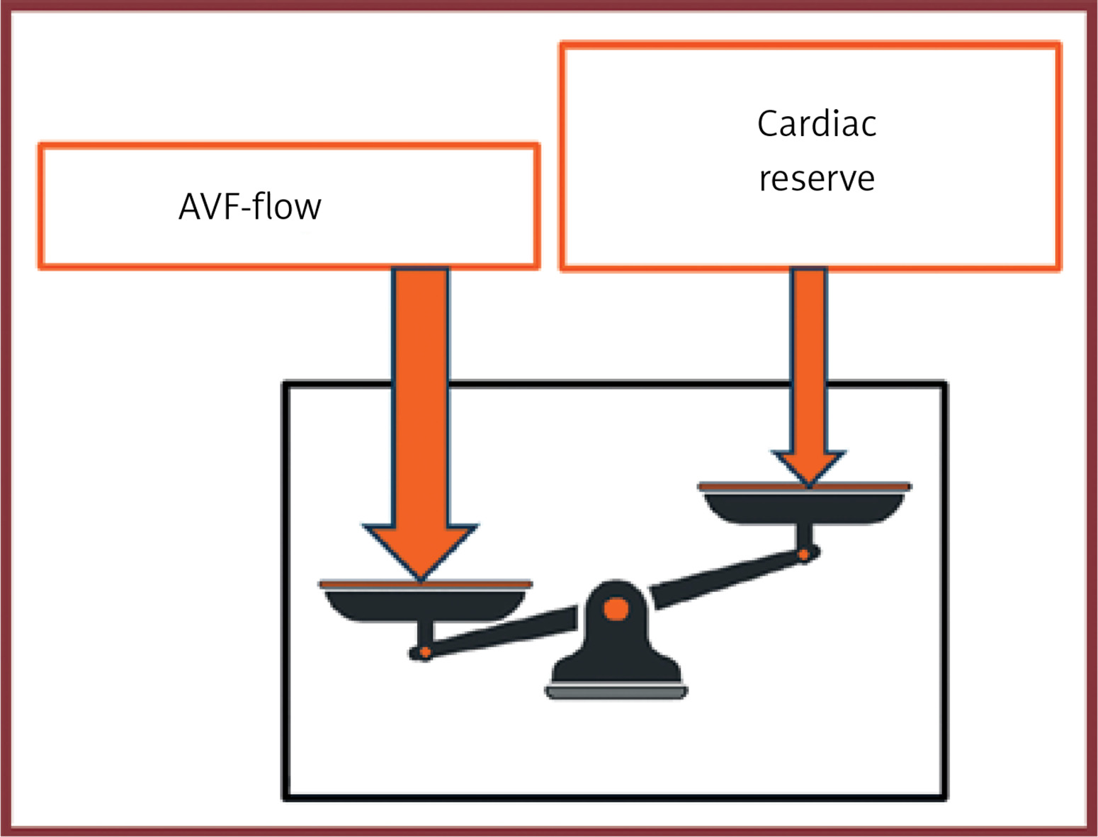 As the above shows, clinical symptomatology is the result of an interplay between the severity of prior cardiac comorbidity and the AVF flow (Figure 3). Patients with a normal heart may tolerate extreme flow volumes with no apparent clinical symptoms. On the other hand, patients with reduced myocardial reserves (e.g. with subclinical or mild HF) will show severe HF symptoms even with low or normal AVF flows. Consequently, it is important to timely identify the small subgroup of patients with an increased risk of developing HF after AVF creation.