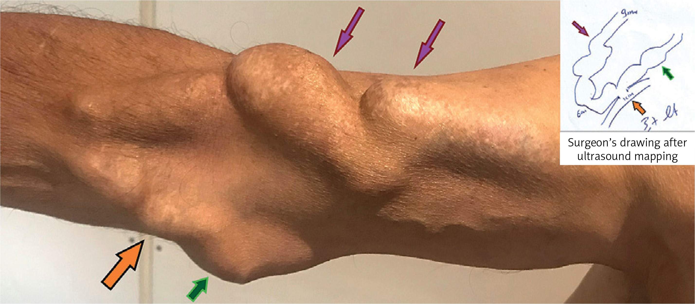 Arteriovenous fistula flow patterns may change substantially after months or years, due to both venous outflow tract dilatation and arterial wall remodeling. Gradually increasing flow occurs typically in brachiocephalic and brachiobasilic AVFs and is less common in radiocephalic AVFs or arteriovenous grafts (AVGs). Grafts cannot dilate over time. In contrast, AVF chronic dilation may sometimes be severe, leading to a megafistula formation, which is defined as generalized aneurysmal dilatation of the outflow venous path (Figure 2). It has been reported that for an AVF flow rate below 2.2 l/min, the CO increase is in proportion to the AVF flow. But when the flow rate exceeds 2.2 l/min, the CO increase cannot compensate for the functional overload, suggesting that there is a threshold above which cardiac compensation is compromised. Consequently, in the early stages, a hyperdynamic state with increased heart rate, stroke volume (SV), CO and left ventricular ejection fraction (LVEF) occurs. At some point this hyperdynamic circulation may be combined with signs and symptoms of heart failure (HF) (high-output heart failure (HOHF) with increased or preserved LVEF) but in the long term it leads to reduced LVEF via reduced myocardial contractility (HOHF with reduced LVEF) [6].