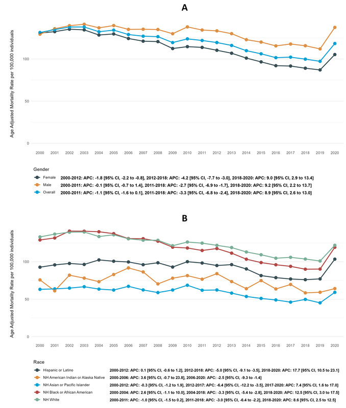 Non-Hispanic (NH) White populations had the highest AAMR (121.6, 121.4 to 121.9), followed by NH Black (115.5, 114.7 to 116.3), Hispanic (90.6, 89.8 to 91.4), NH American Indian (71.8, 69.3 to 74.3) and NH Asian (56.7, 55.8 to 57.5) populations. NH Whites experienced a significant decline in AAMR (AAPC: –0.8%, –1.2 to –0.5), while AAMRs for NH Asians (AAPC: –0.7%, –1.3 to 0.0), NH American Indians (AAPC: –0.7%, –2.2 to 1.3), NH Blacks (AAPC: –0.6%, –1.3 to 0.0) and Hispanics (AAPC: +0.1%, –0.3 to 0.6) remained consistent (Figure 1 B).