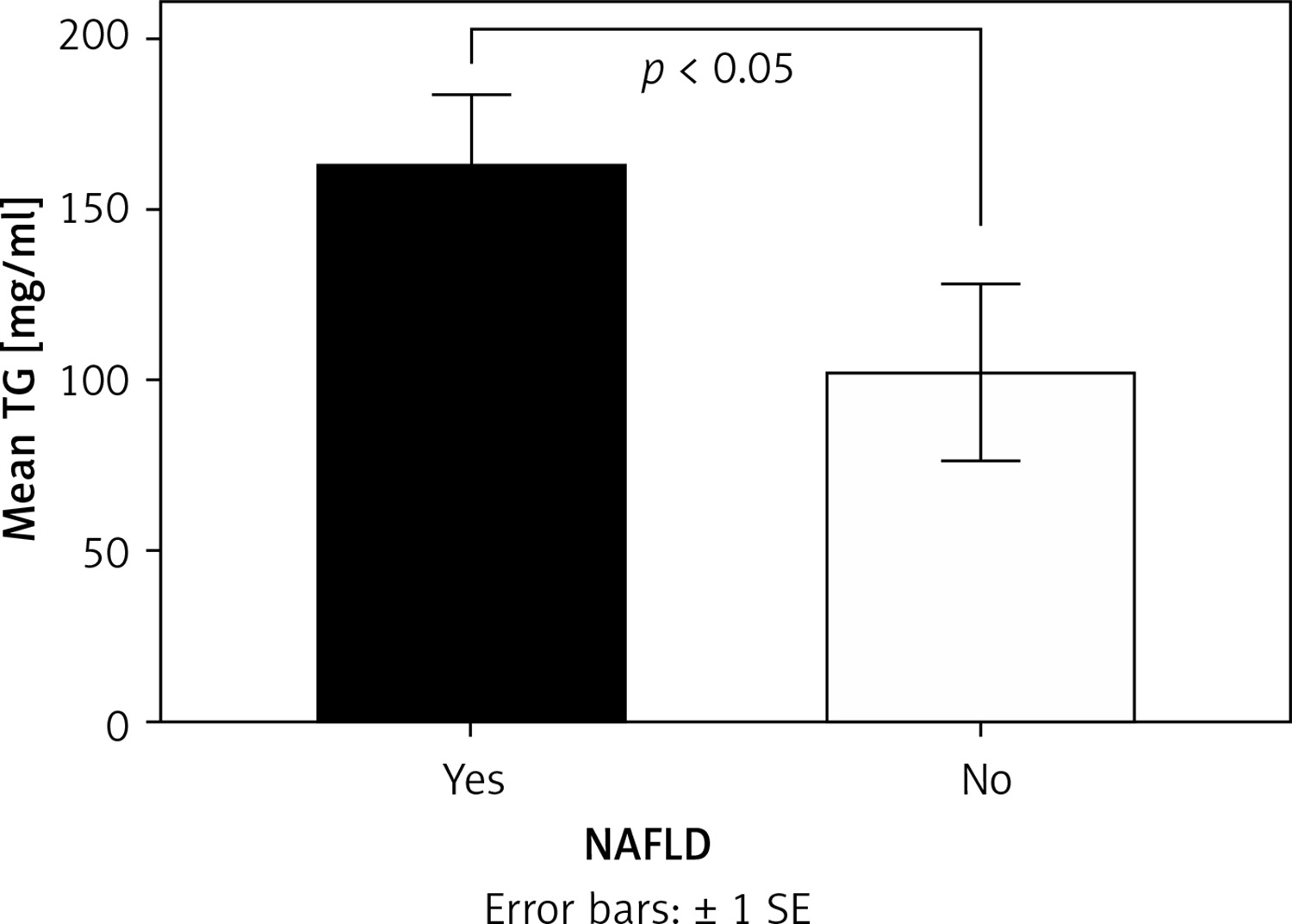 Mean triglyceride (TG) levels according to the presence of non-alcoholic fatty liver disease (NAFLD). Mean values were compared among groups by independent-samples Mann-Whitney U test. Statistical significance was set at p < 0.05