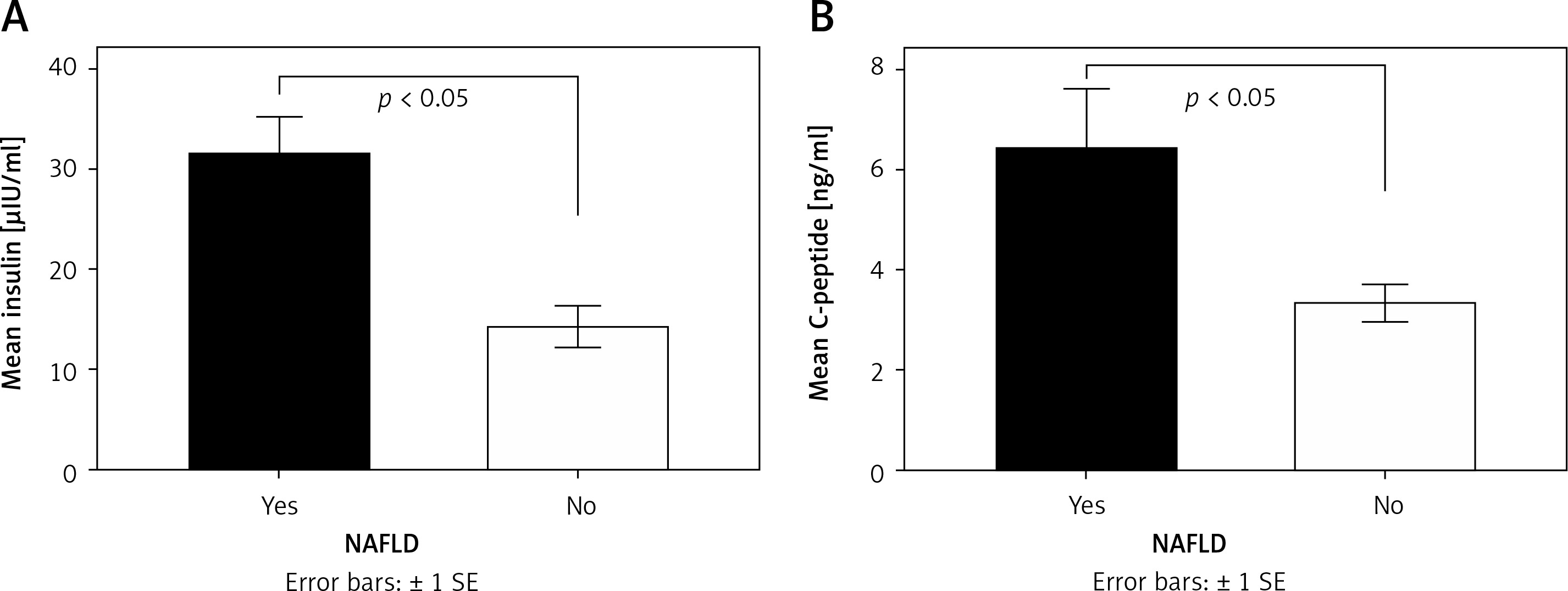 Mean insulin (A) and C-peptide (B) levels according to the presence of NAFLD. Mean values were compared among groups by independent-samples Mann-Whitney U test. Statistical significance was set at p < 0.05