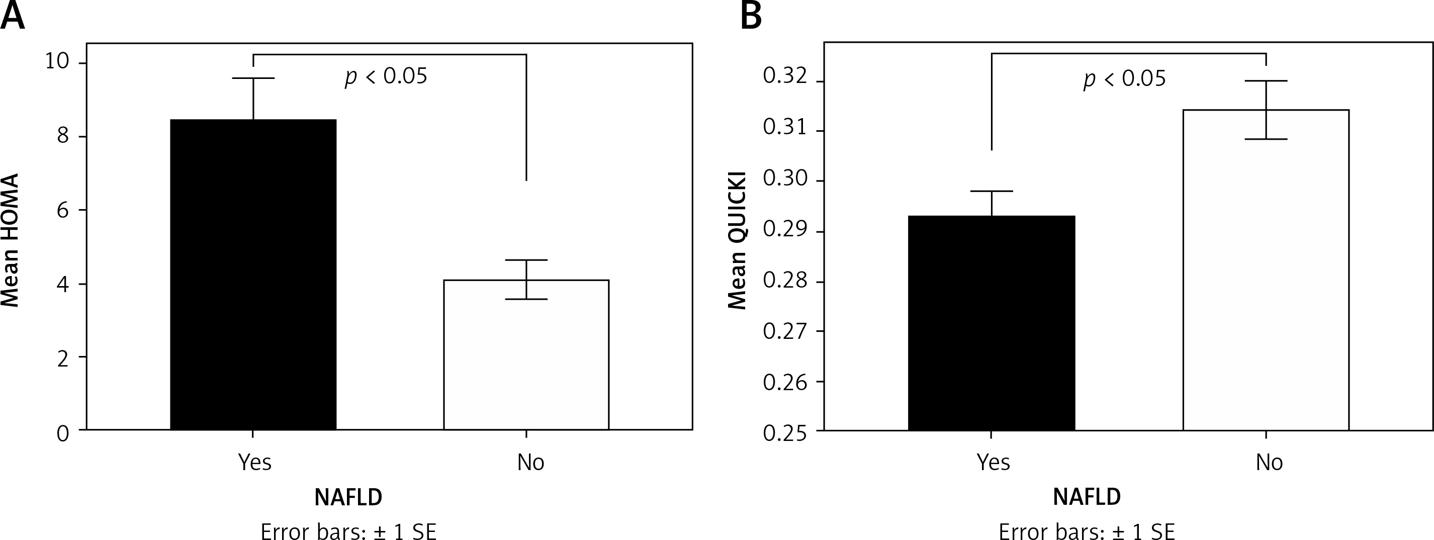 Mean value of Homeostatic model assessment (HOMA) (A) and Quantitative Insulin Sensitivity Check Index (QUICKI) (B) according to the presence of NAFLD. Mean values were compared among groups by independent-samples Mann-Whitney U test. Statistical significance was set at p < 0.05