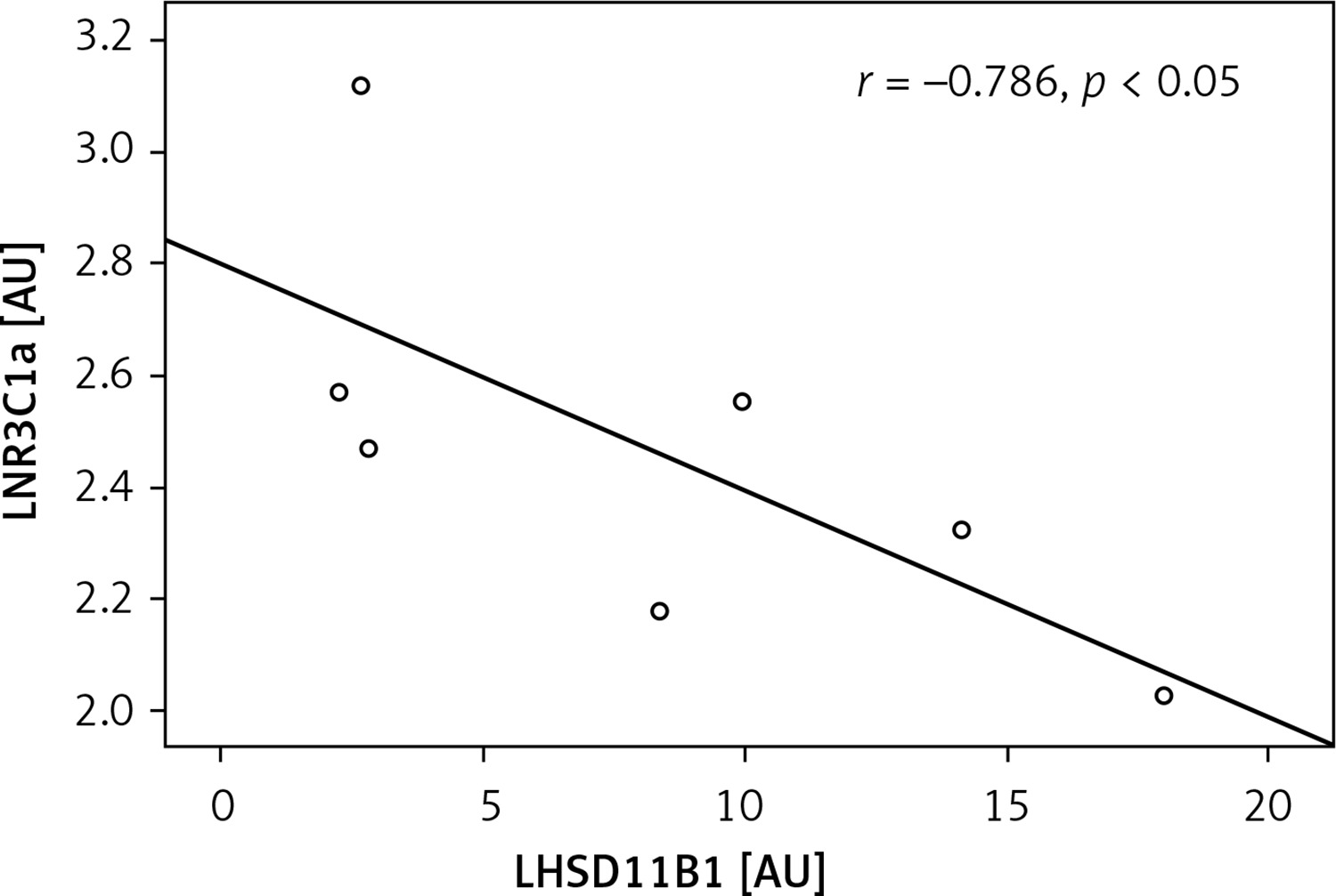Correlation of liver nuclear receptor subfamily 3, group C, member 1 (glucocorticoid receptor) a (LNR3C1a) with liver hydroxysteroid (11-beta) dehydrogenase 1 (LHSD11B1) in NAFLD- group. Bivariate correlation was established by the Spearman’s r-test. Statistical significance was set at p < 0.05