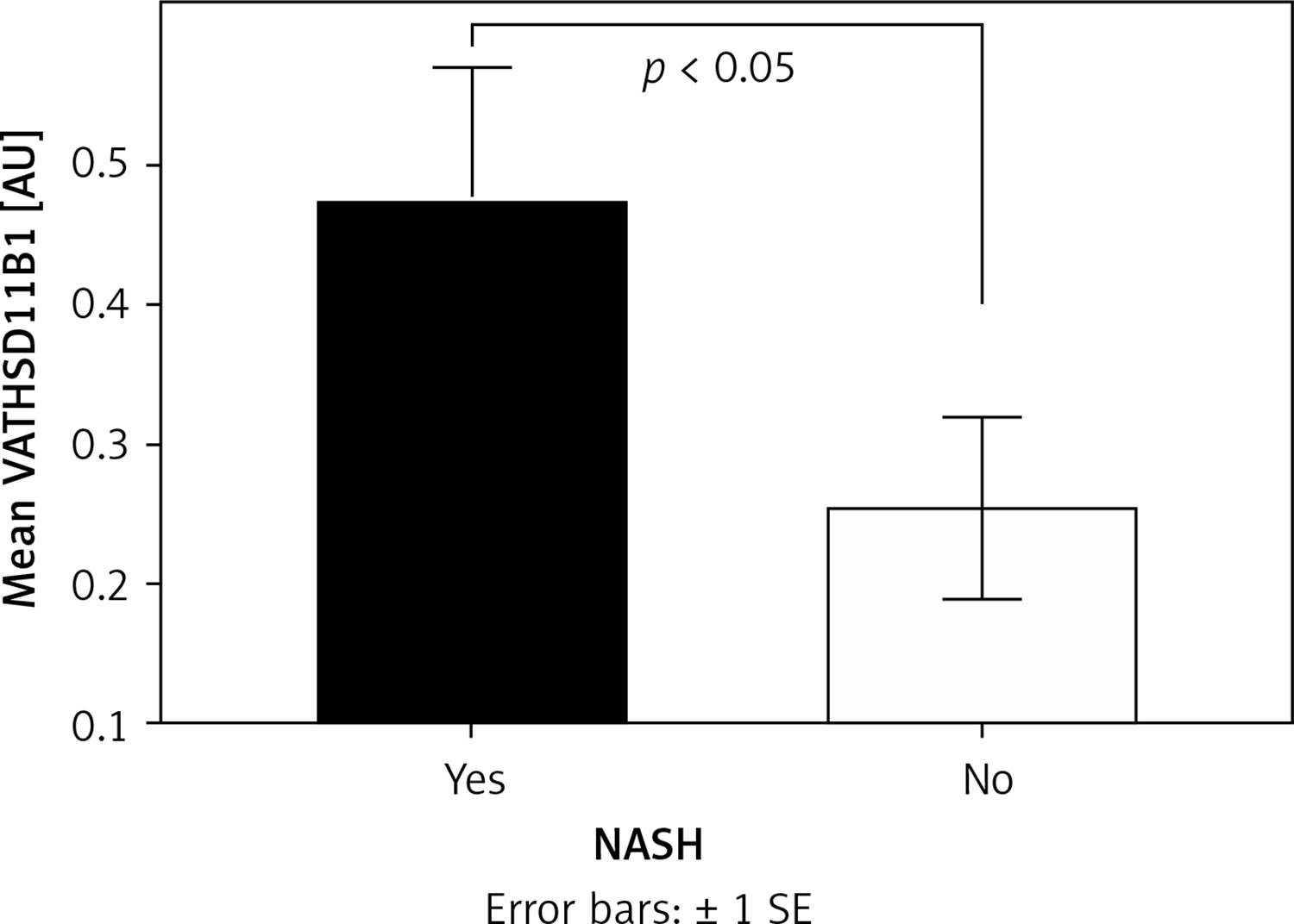 In patients with NASH (NASH+), the expression of VATHSD11B1 was significantly higher compared with the NASH- group (Mann-Whitney U test; NASH+ 0.473 ±0.399 AU, NASH- 0.254 ±0.27 AU; p < 0.05) (Figure 8), whereas in the SAT (Mann-Whitney U test; NASH+ 0.343 ±0.224 AU, NASH- 0.292 ±0.235 AU; NS) and liver (Mann-Whitney U test; NASH+ 6.41 ±4.764 AU, NASH- 7.024 ±4.83 AU; NS) there was no significant difference between groups.