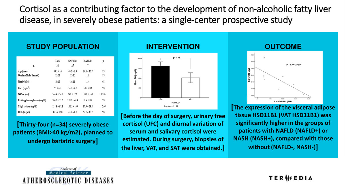 In reviewing the literature, we observed that in recent years, growing evidence from different studies supports the relationship between the expression of HSD11B1 and NAFLD. HSD11B1 is the enzyme responsible for the regeneration of cortisol from inactive cortisone, thus enhancing its action at a pre-receptor level in key metabolic tissues such as the liver and adipose tissue [31–34]. According to a study by Paterson et al. [35], transgenic mice, overexpressing HSD11B1 selectively in the liver, finally developed MetS without obesity, which was found to be associated, among other factors, with fatty liver. Moreover, in a study by Candia et al. [36], human 11β-HSD1 expression in VAT was found to be associated with NAFLD. Findings from another study [37] supported that the inhibition of 11β-HSD1 was an effective method to reduce the liver fat content in humans. Nevertheless, the available data remain limited.
