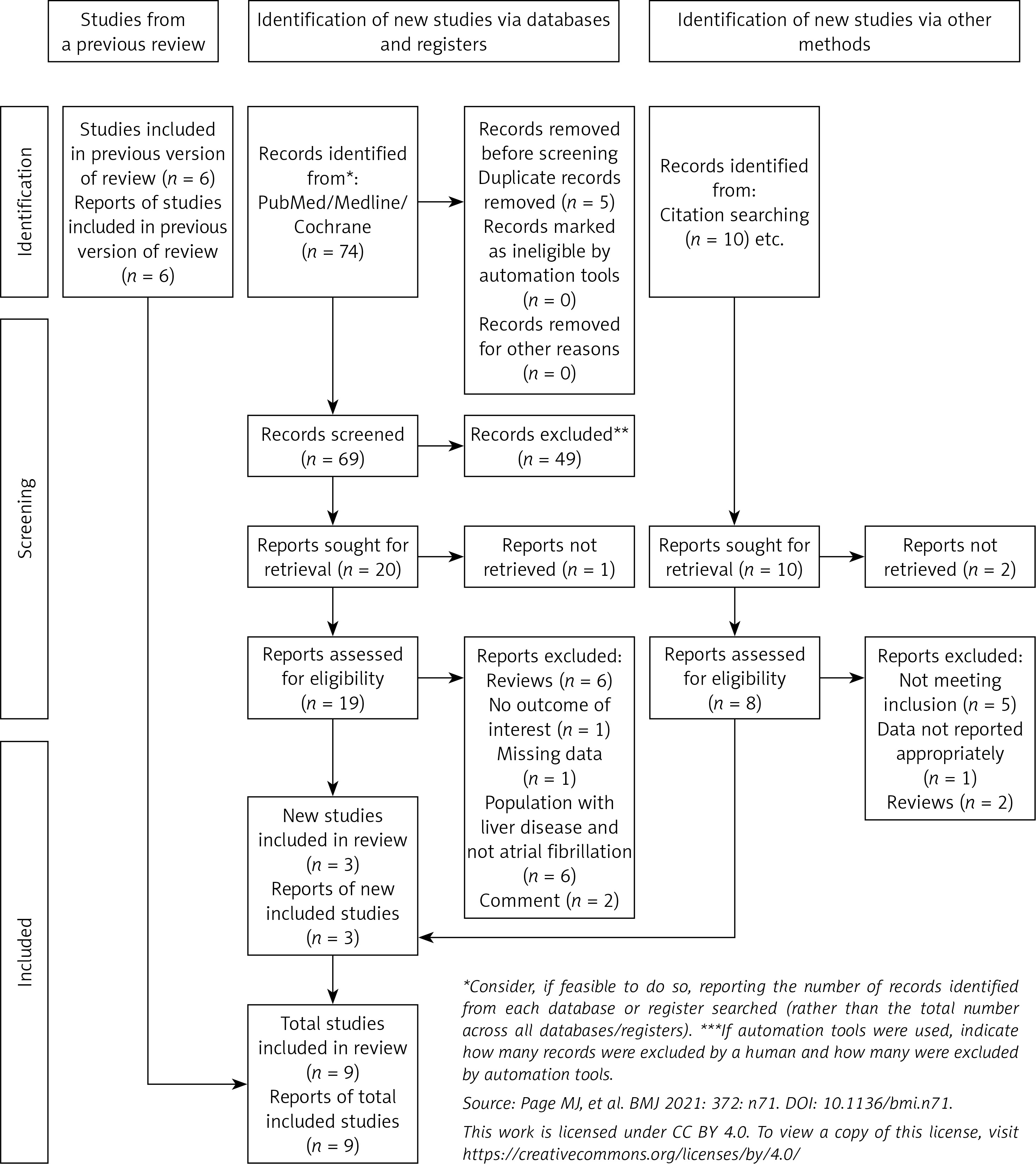 The search identified a total of 74 articles. After removing 5 duplicates with Zotero, 45 articles were excluded based on the title and abstract review. Of the remaining 23 articles, 3 were found to meet the inclusion criteria. Studies were excluded if they were reviews, comments, did not meet the population criteria, or had missing data or irrelevant outcomes. By adding 6 studies from a previously published systematic review on the same topic [19], a total of 9 studies were included in this updated review. A manual search of reference lists from relevant studies, reviews, and meta-analyses did not uncover any additional eligible studies. The PRISMA diagram in Figure 1 illustrates the comprehensive search strategy employed.