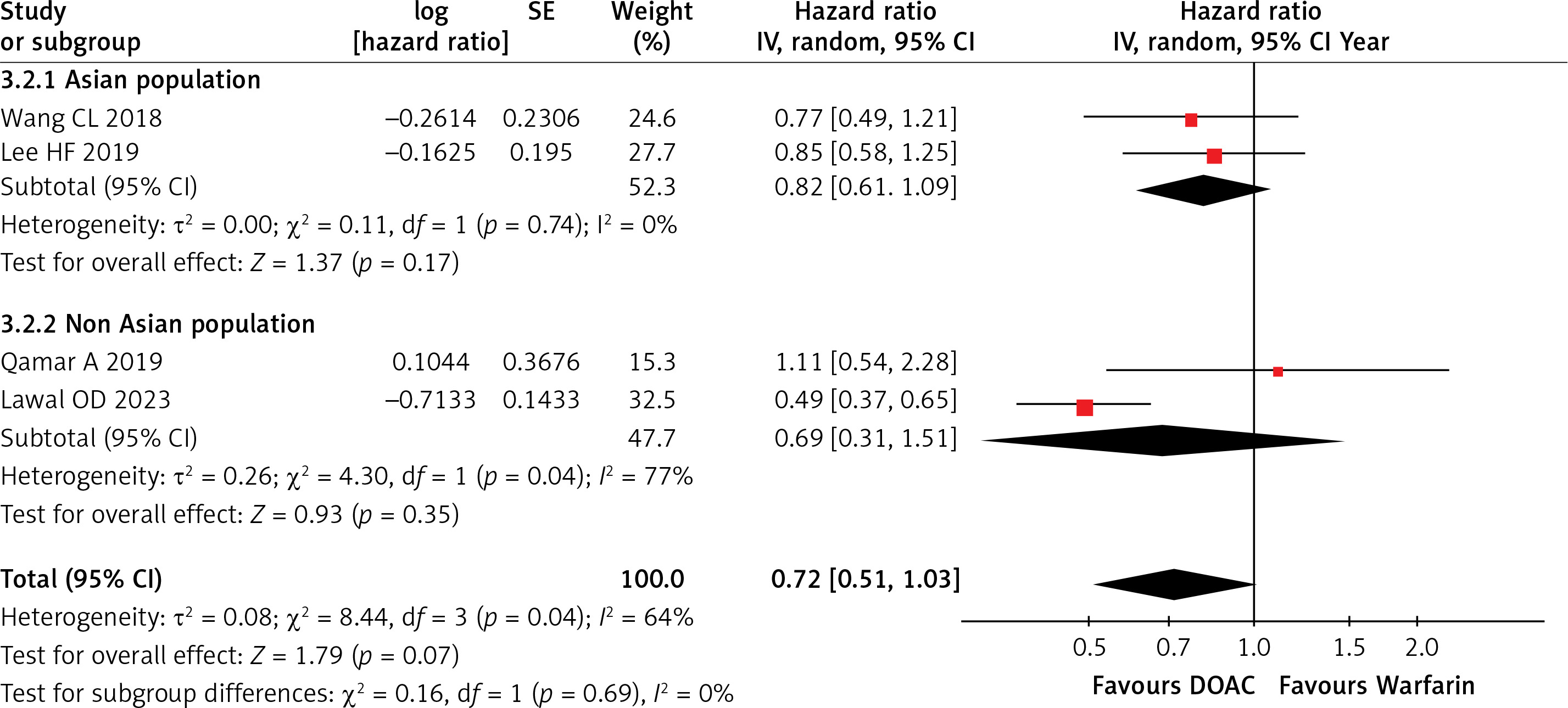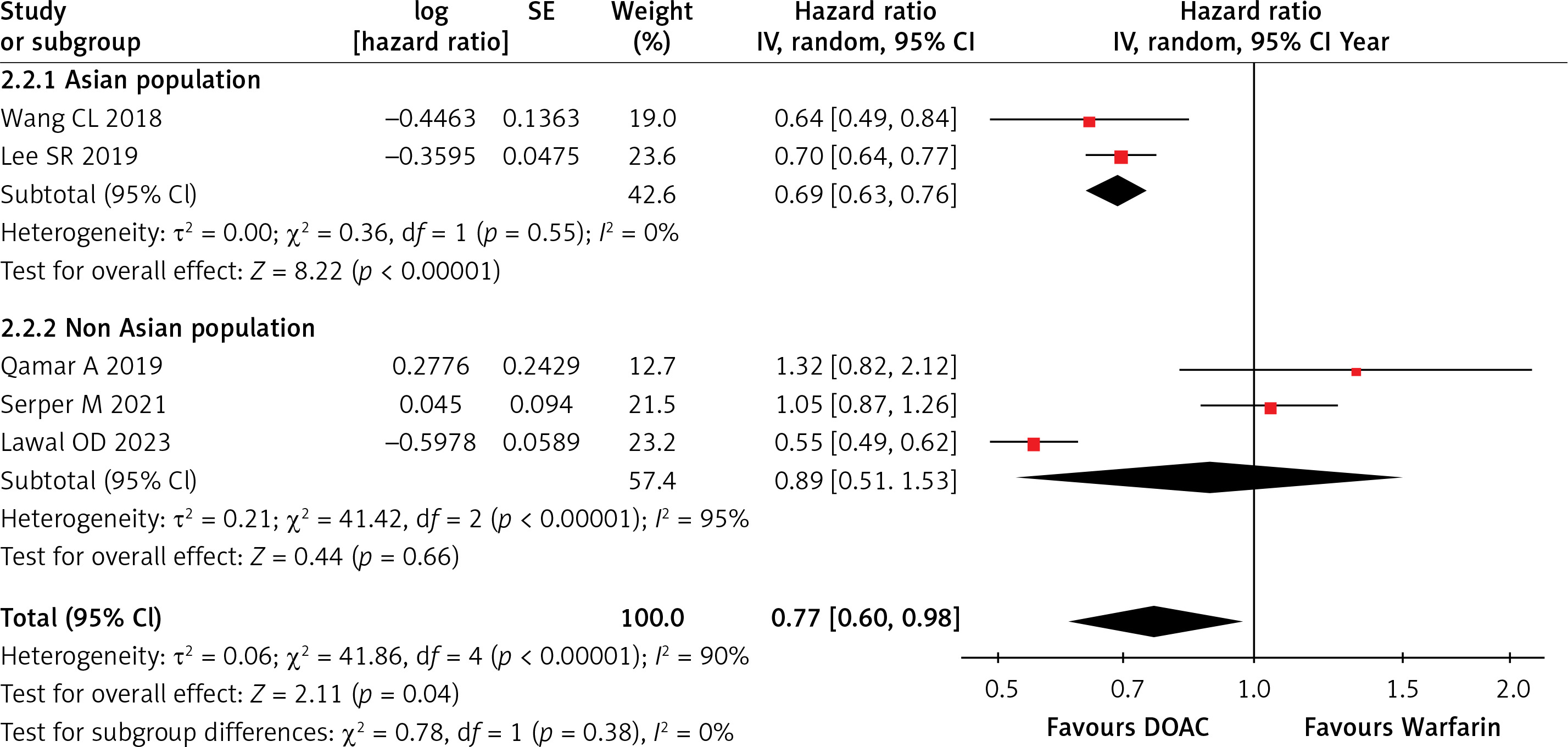 We performed the subgroup analysis for all-cause death based on the study populations, i.e. Asian and non-Asian patients. The pooled analysis showed that treatment with DOAC was significantly associated with a decreased risk of all-cause death, while on subgroup analysis, it was shown that in Asian populations, the risk of all-cause death was significantly reduced (p = 0.00001) as compared to non-Asian populations (p = 0.66). In terms of heterogeneity, it was 0% across all (Asian and non-Asian) studies for the ICH outcome, but in case of the all-cause death outcome, it was 0% for Asian patients (indicating consistencies across all studies) and 95% for non-Asian patients (indicating significant variability across all studies).