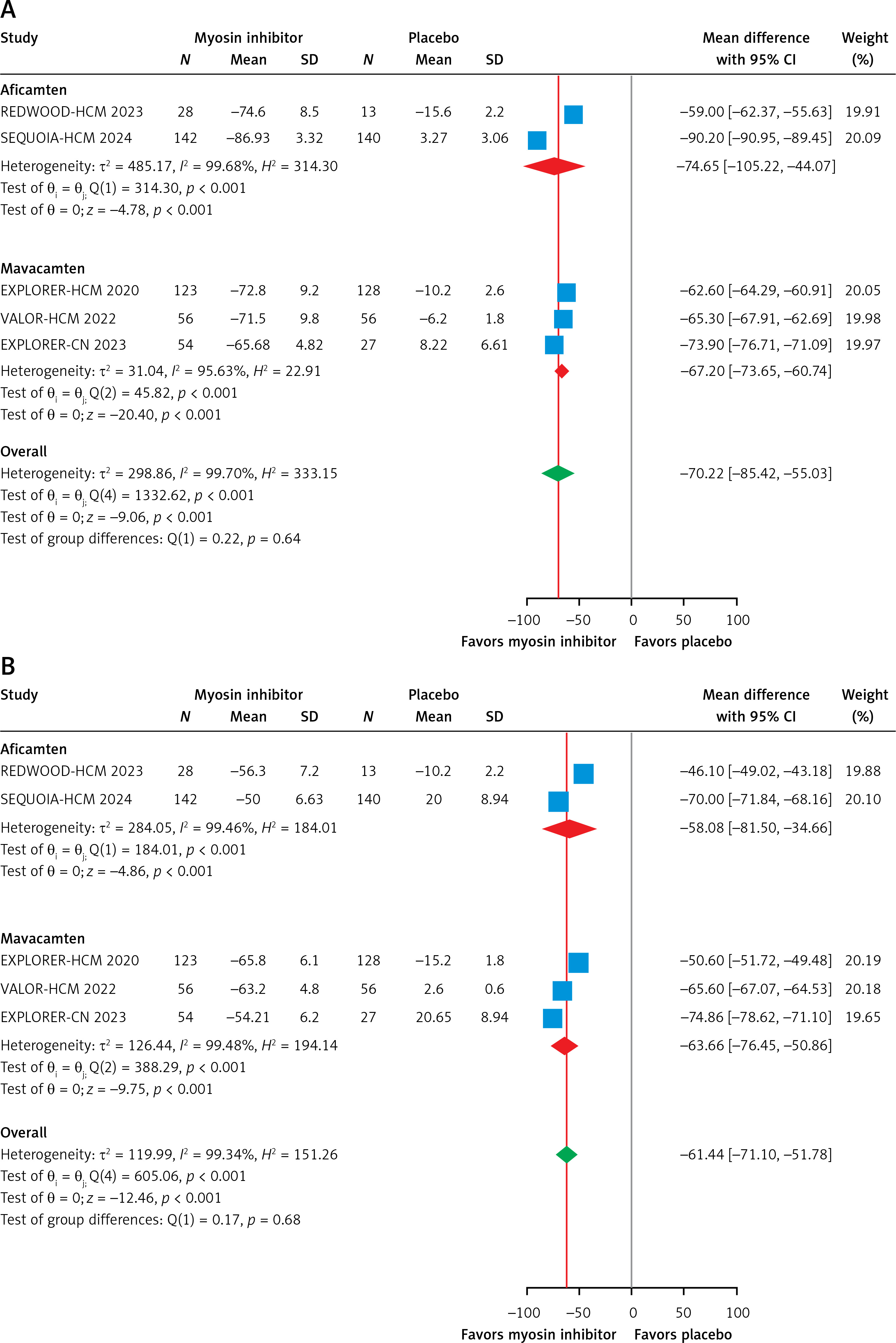 A – Subgroup analysis forest plot showing the mean difference of LVOT gradient in patients with HCM treated with a myosin inhibitor versus placebo. B – Subgroup analysis forest plot showing the mean difference of Valsalva LVOT gradient in patients with HCM treated with a myosin inhibitor versus placebo