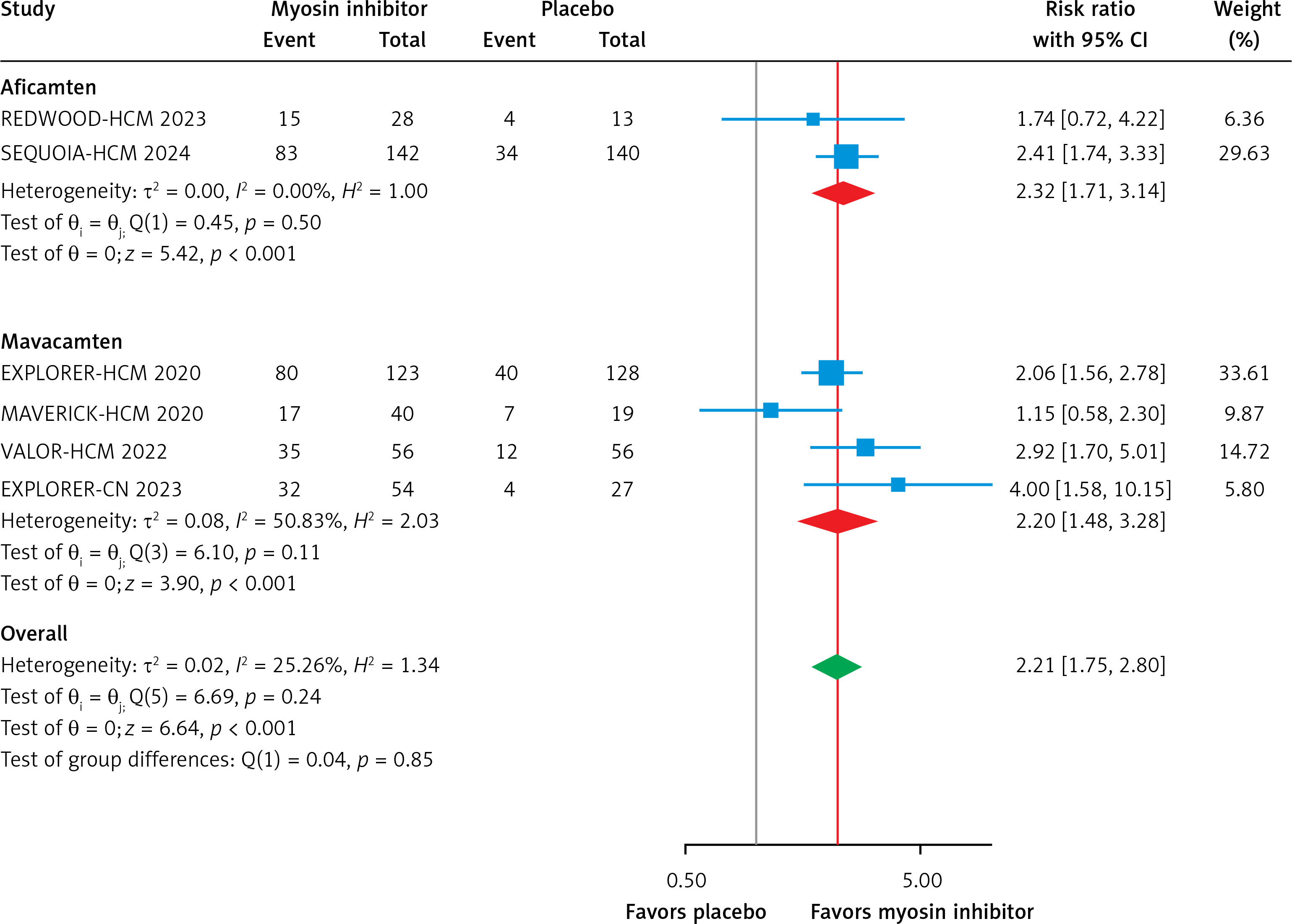 We used the original data to calculate risk ratios (RRs) and their corresponding 95% confidence intervals (CIs) for dichotomous outcomes, applying a random effects model. For continuous outcomes, a meta-analysis of the weighted mean difference (WMD) and its 95% CI was conducted, also using the random effects model to account for variability across studies. To evaluate the level of heterogeneity among the studies, we employed the Higgins I² statistic, categorizing heterogeneity as follows: mild heterogeneity (I²) between 25% and 50%; moderate heterogeneity (I²) between 50% and 75%; severe heterogeneity (I²) exceeding 75% [12]. Subgroup analysis was performed based on the type of myosin inhibitor, aficamten vs. mavacamten. This approach allowed us to effectively account for variations in study designs and populations, ensuring more robust conclusions in our meta-analysis. In all analyses, a p-value of < 0.05 was considered statistically significant. The meta-analyses were performed using STATA statistical software (version 18.5; STATA Corp LP, College Station, TX, USA) to ensure precise and consistent calculations throughout the study. This threshold for statistical significance was applied to determine the robustness of the results across different study outcomes.