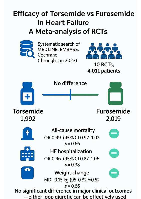 Loop diuretics are a cornerstone in the symptomatic management of heart failure. There is conflicting evidence regarding potential differences between torsemide and furosemide in their effects on heart failure outcomes. Therefore, we conducted a meta-analysis of randomized controlled trials (RCTs) to compare the therapeutic efficacy of furosemide versus torsemide in the management of heart failure.
