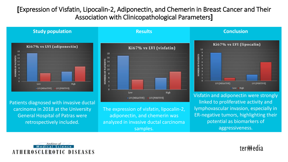 Breast cancer diagnosed cases were analyzed in 2018 at the University General Hospital of Patras. Immunohistochemistry was performed for visfatin, lipocalin-2, adiponectin, and chemerin. Marker expression was correlated with estrogen receptor (ER), progesterone receptor (PR), HER2/c-ERB2, Ki67, and lymphovascular invasion (LVI).