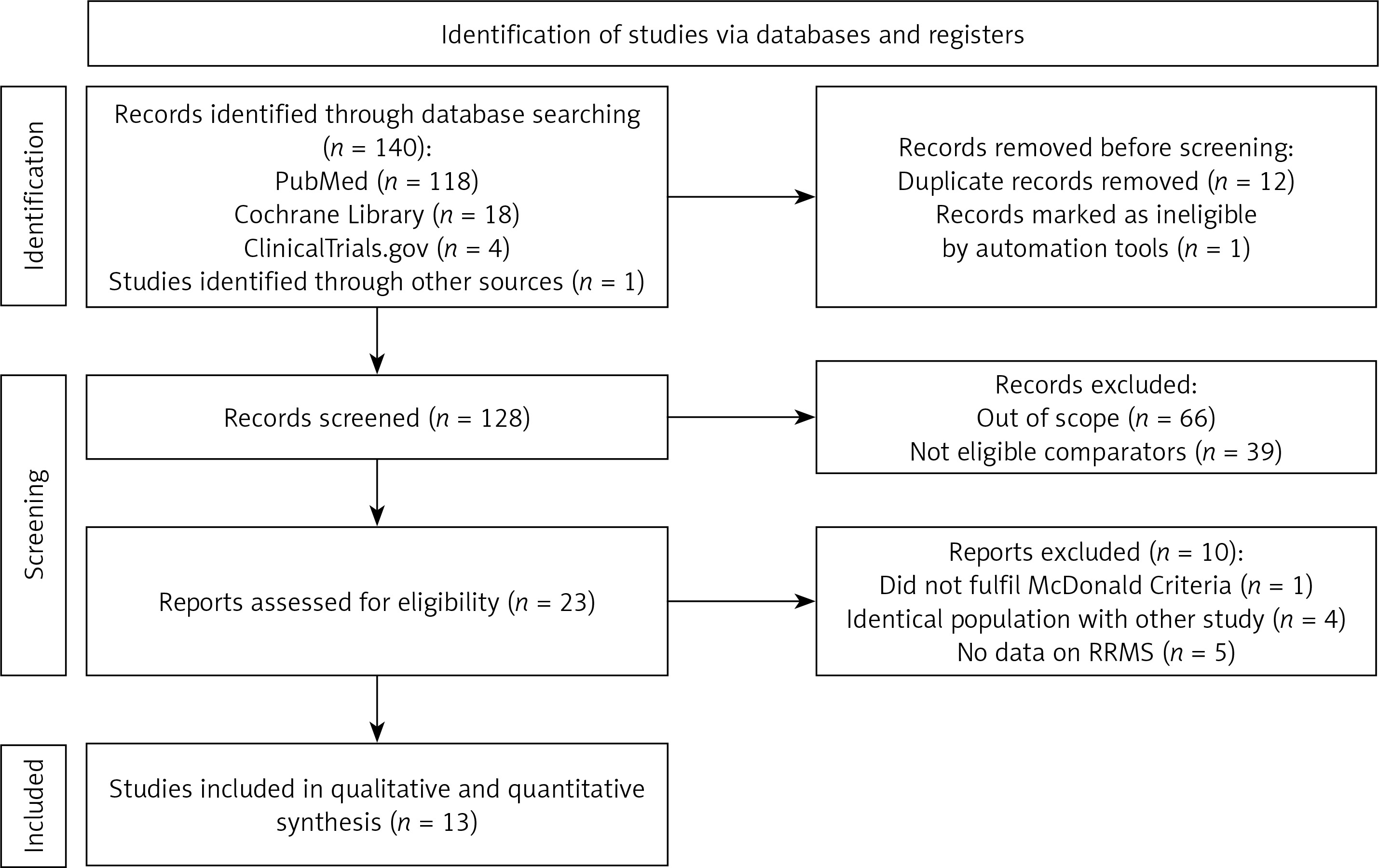 Of the total 128 screened articles, we identified 13 eligible studies which fulfilled the inclusion criteria [11–23]. A PRISMA flowchart showing the study selection process was created (Figure 1). Excluded studies together with the reasons for exclusion, are shown in Table I [5, 24–32].