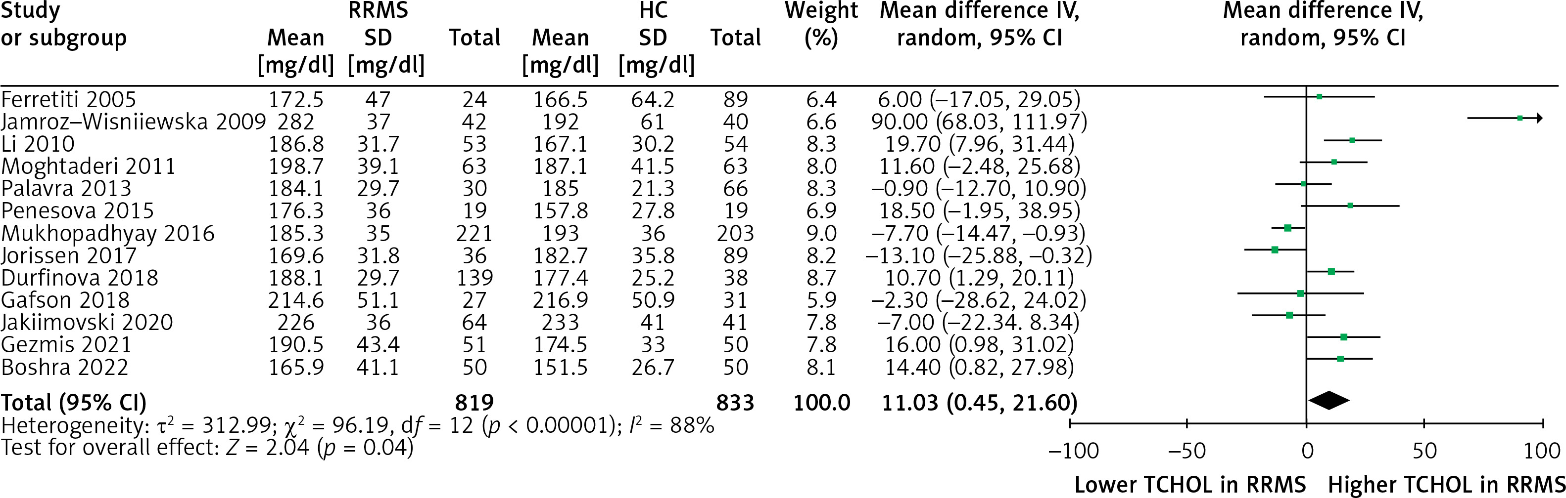 Regarding the secondary outcome of LDL-C, a non-significant higher LDL-C concentration in the RRMS population compared with that of the HC group (MD = 5.22, 95% CI: (–2.23, 12.68), p = 0.17, I2 = 79%) was observed (Figure 3). Regarding TC levels, the RRMS group exhibited slightly significantly higher concentrations compared to the HC group (MD = 11.03, 95% CI: (0.45, 21.60), p = 0.04, I2 = 88%) (Figure 4).