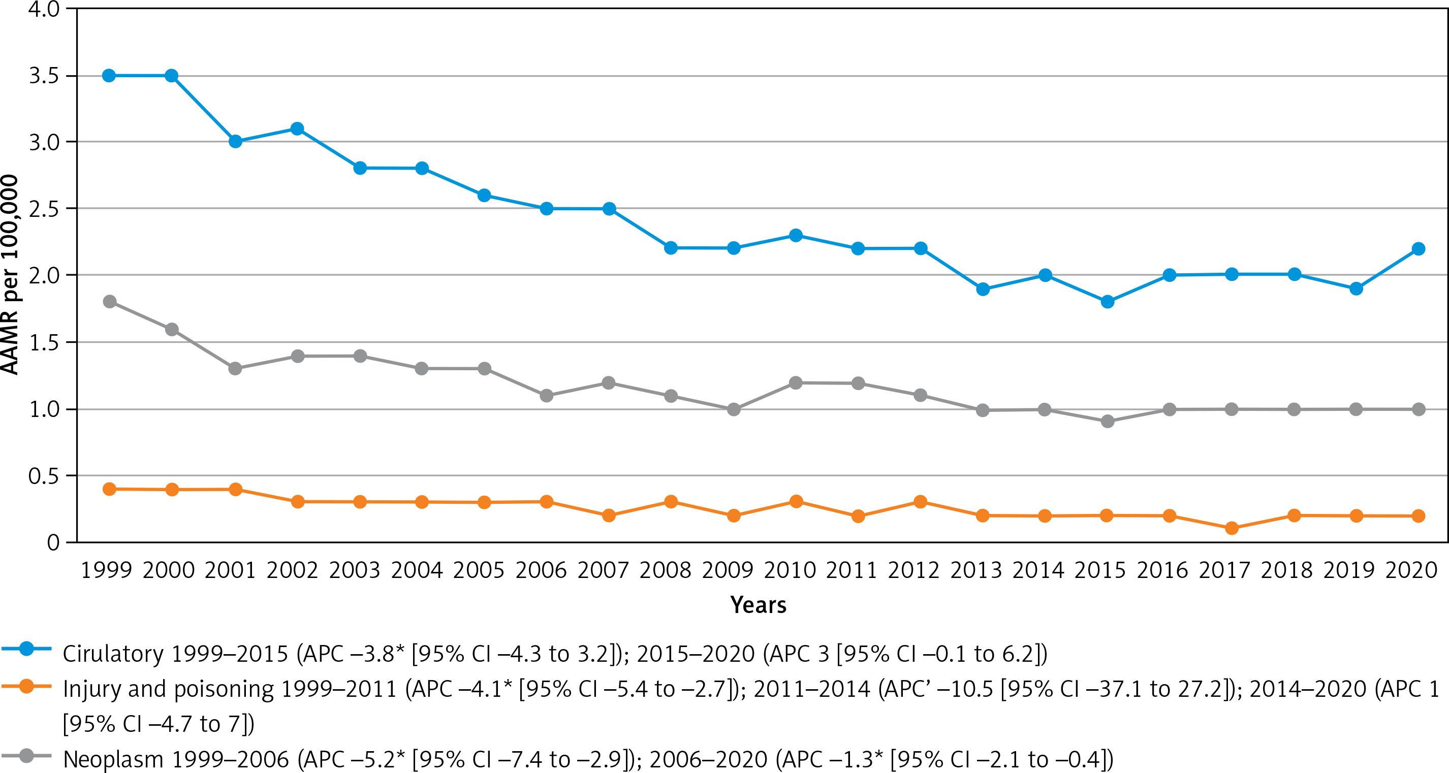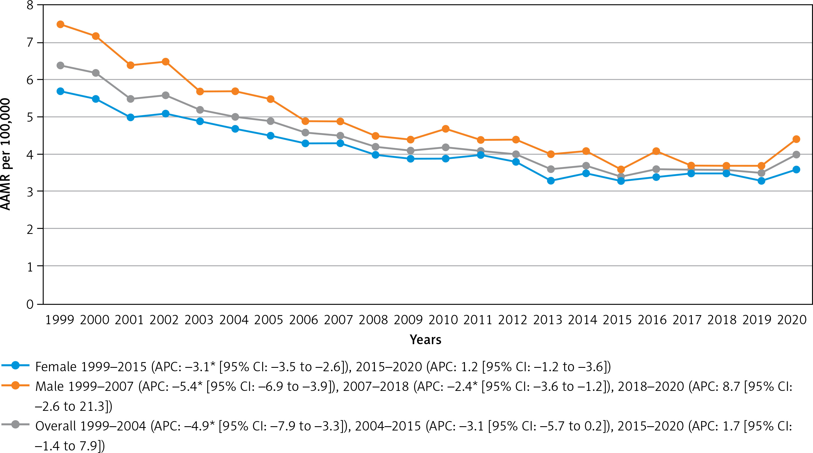 The AAMR was highest for the age group of 85+ years, followed by 75–84 years, and lowest for 65–74 years. The people in the age group 85+ years showed a steady decrease from 1999 to 2020 (AAPC = –4.2; 95% CI: –4.6 to –3.7). The population aged 75–84 years showed a steep decline from 1999 to 2008 (APC = –4.3; 95% CI: –5.4 to –3.3) followed by a gradual decline until 2020 (APC = –1.6; 95% CI: –2.8 to –0.6). The patients in the group aged 65–74 years had a sharp declining trend from 1999 to 2006 (APC = –4.8; 95% CI: –6.1 to –3.5) followed by a gradual decline until 2016 (APC = –1.9; 95% CI: –2.8 to –1.1) and then a rise until 2020 (APC = 4.9; 95% CI: 1.9 to 8) (Supplementary Figure S1, Supplementary Table SIV).