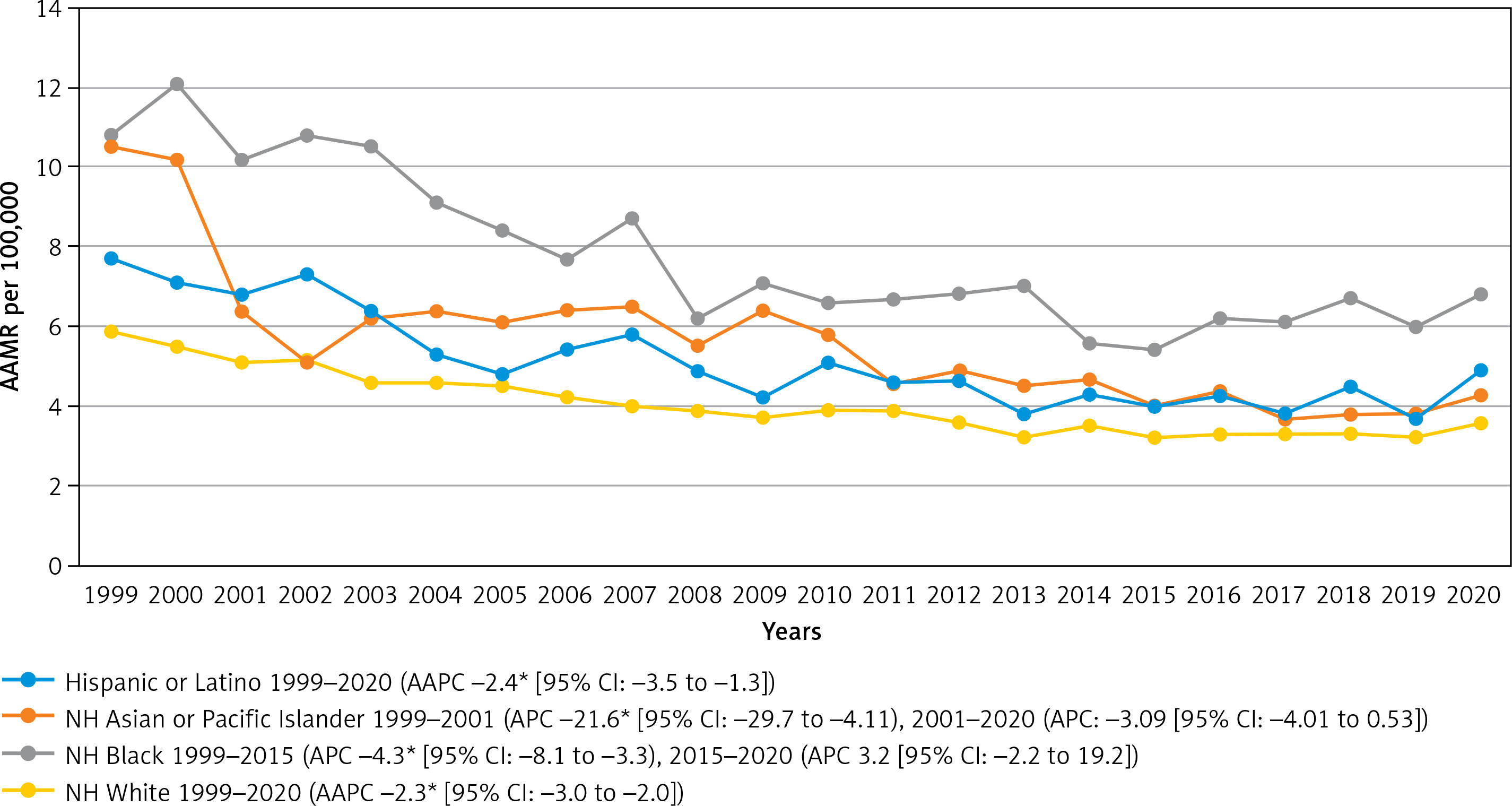 In terms of racial/ethnic distribution, the highest mortality rate during the study period was observed in NH African American or Black patients, with an AAMR of 7.6 (95% CI: 7.4 to 7.8), and the lowest in NH White patients, with an AAMR of 4.0 (95% CI: 3.9 to 4.0) (Supplementary Table SIII). In NH African Americans, the AAMR was 10.8 in 1999 and declined to 5.4 by 2015 (APC = –4.3; 95% CI: –8.1 to –3.3), followed by a rise to 6.8 until 2020 (APC = 3.2; 95% CI: –2.2 to 19.2). The AAMR in Asians or Pacific Islanders decreased sharply from 10.5 in 1999 to 6.4 in 2001 (APC = –21.6; 95% CI: –29.7 to –4.1) and then continued decreasing steadily until the end of the study period, reaching 4.3 (APC = –3.1; 95% CI: –4.01 to 0.53). The AAMR in NH Whites and Hispanics showed a steady decline during the study period, with an average APC of –2.3 (95% CI: –3.0 to –2.0) in NH Whites and –2.4 (95% CI: –3.5 to –1.3) in Hispanics, respectively (Figure 2, Supplementary Table SIII).
