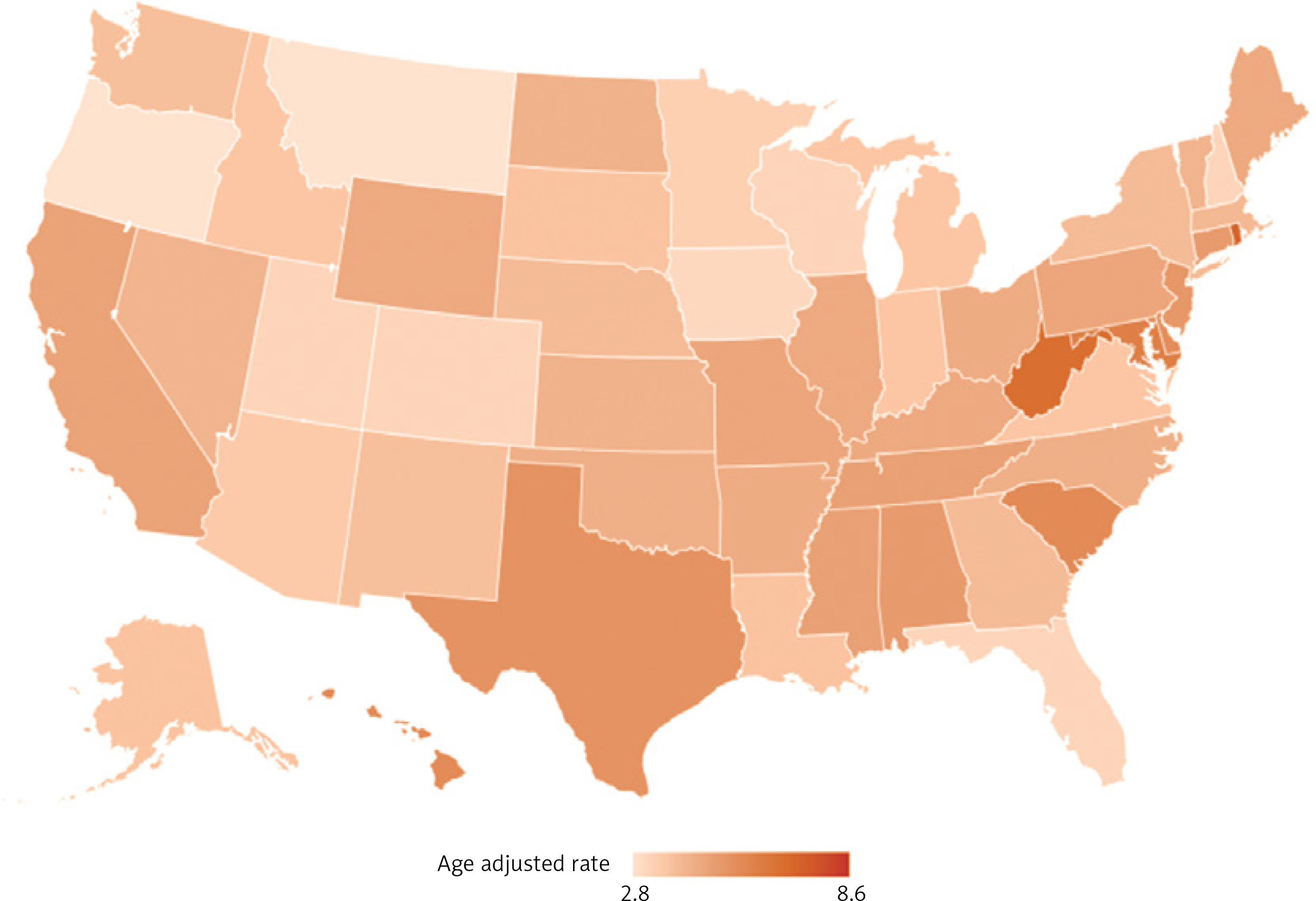 States exhibited significant differences in AAMR, with values ranging from 8.6 in the District of Columbia to 2.8 in Montana. States in the upper 90th percentile of AAMRs included the District of Columbia, Rhode Island, West Virginia, Maryland, and Hawaii. These states had AAMRs that were nearly three times higher than those in the lower 10th percentile, which included New Hampshire, Colorado, Iowa, Oregon, and Montana (Supplementary Table SVII, Figure 3).