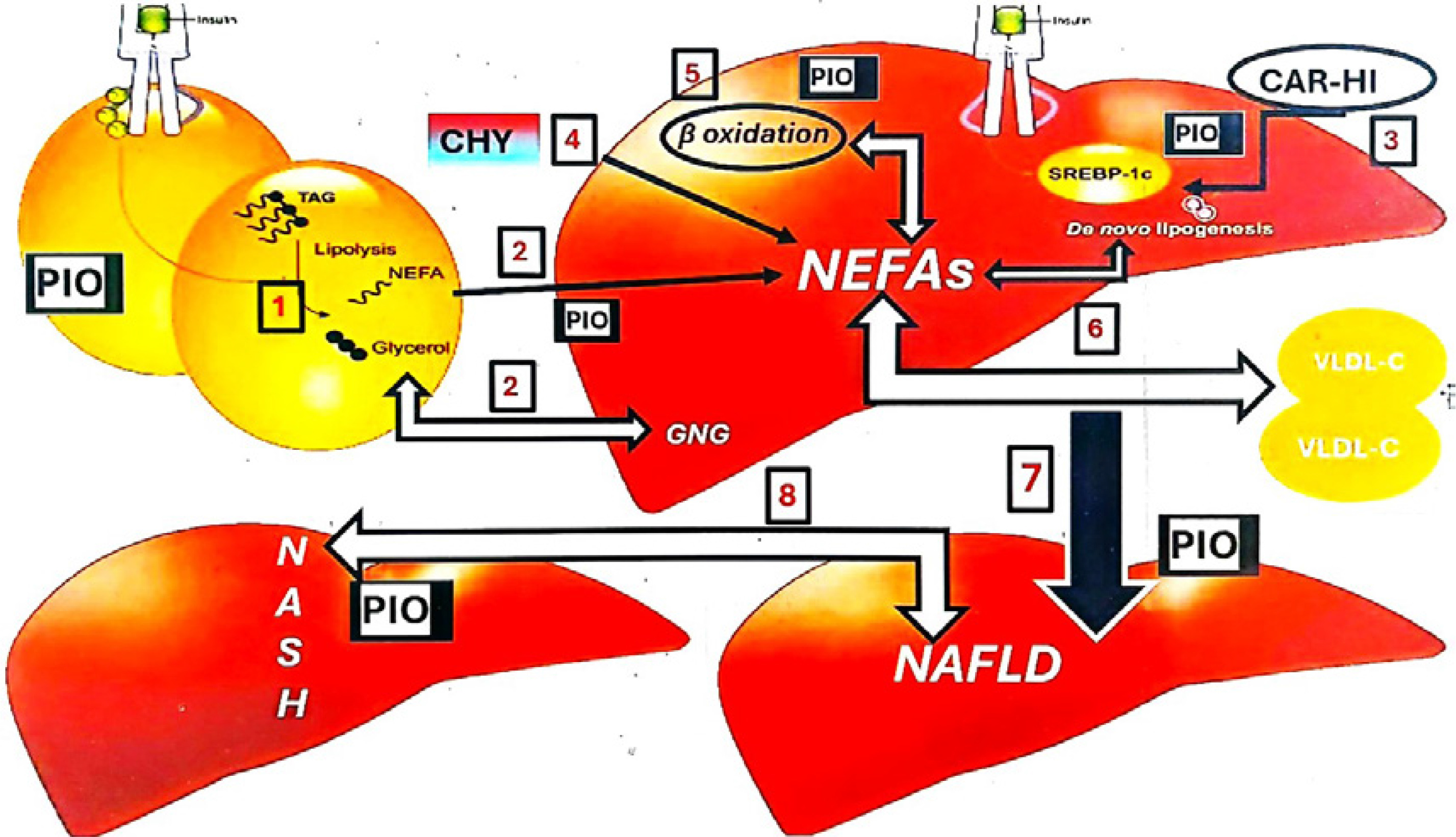 NAFLD: pathophysiological background and the intrahepatic activity of PIO. Increased levels of NEFAs in the liver are mainly the result of: 1. Stimulated lipolysis from visceral fat since hormone-sensitive lipase cannot be sufficiently downregulated during an insulin resistant state 2. Higher amounts of NEFAs are delivered from visceral fat into the hepatocytes, while glycerol is used as a main substrate for hepatic GNG 3. De novo lipogenesis from excess CAR (glucose and fructose). This is achieved after the activation of SREBP-1c that is extremely sensitive to HI 4. The metabolism of intestinal CHY that penetrate the liver through the portal system. After entering the liver NEFAs: 5. Can be transported into the mitochondria and metabolized through β-oxidation 6. Can be converted to neutral TAG, packaged into VLDL-C particles and secreted into the circulation 7. When these cellular pathways are overwhelmed and hepatic lipid storage overcomes lipid clearance and utilization, excess intrahepatic TAG levels can form cytosolic intracellular fat droplets and eventually steatosis 8. Several mechanisms including altered secretion of adipokines/cytokines, hepatokines, stimulation of multiple inflammatory pathways, endoplasmic reticulum stress, increased oxidative stress (in a complex interplay with genetic predisposition) drive the evolution of inflammation, hepatocellular injury and fibrosis promoting NASH. PIO can: (i) suppress lipolysis from visceral adipose tissue; (ii) upregulate fatty acid translocase, which is the enzyme that moves circulating NEFAs into adipocytes, so less NEFAs are available for infiltration into the liver; (iii) promote diversion of fat storage from hepatocytes to adipocytes; (iv) stimulate NEFAs oxidation in hepatocytes; (v) downregulate de novo lipogenesis after suppressing HI; (vi) reduce the production/secretion of several adipokines/cytokines that promote inflammation and (vii) stimulate the secretion/activity of adiponectin.