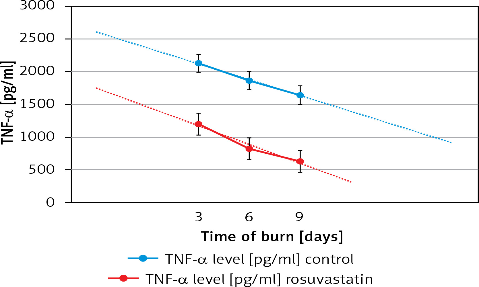 Based on Figure 7, burn-wounded rats expressed significant increases in serum TNF-α levels. We can also note that TNF-α serum levels rise after the first post-burn hours and approach their maximum values on the third day and their minimum on day 9, not only for the study but for control groups as well. Moreover, the curve that represents each group seems to be similar. However, the concentration of TNF-α is statistically significantly different (p < 0.05) between rosuvastatin- and non-rosuvastatin-treated rats, concerning all post-wound studied points.
