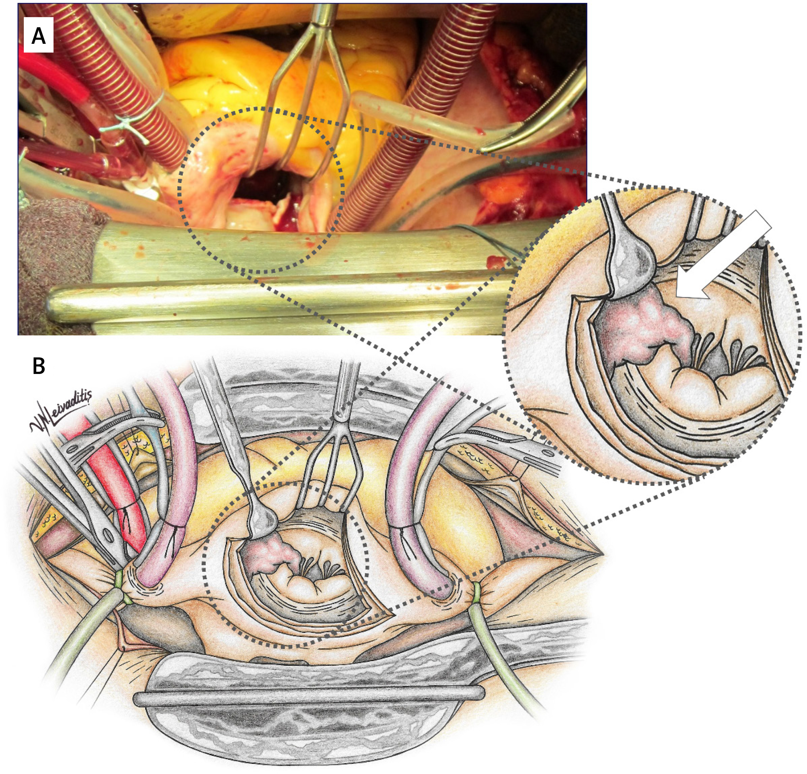 Intraoperative image showing the thrombus in the left atrium extending over the mitral valve (arrow). A – Actual intraoperative photograph. B – Schematic representation of the operative field