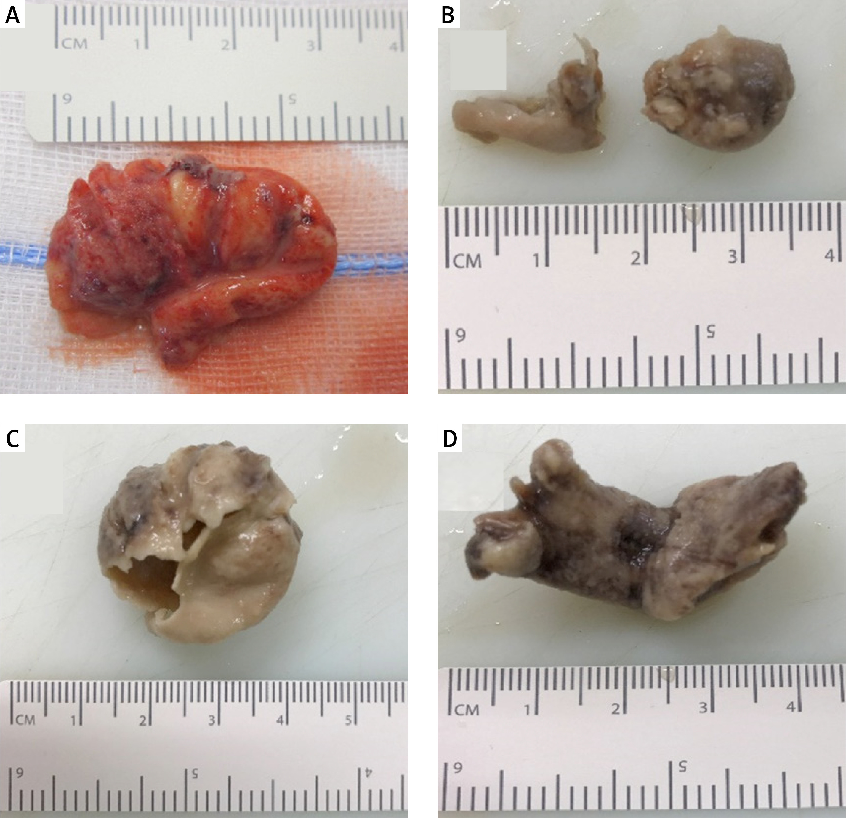 Resected thrombotic material. A, B – the thrombus removed from the left atrium, C, D – the thrombus removed from the right atrium
