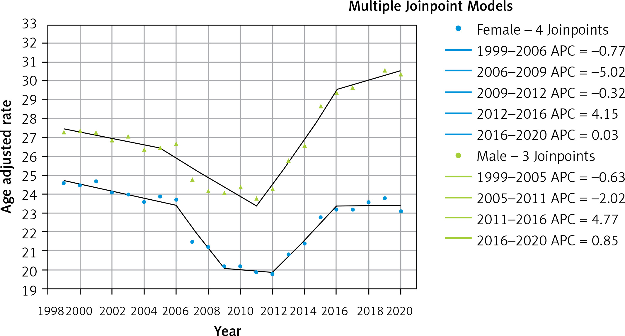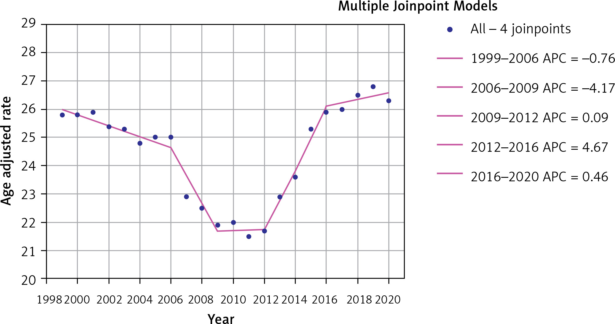 With an overall AAPC = 0.11; 95% CI: –0.69, 0.91, the AAMR was 25.8 (95% CI: 25.6, 26.0) in 1999 and 26.3 (95% CI: 26.1, 26.5) in 2020. Between 1999 and 2006 (APC = –0.76; 95% CI: –1.23, –0.29) and between 2006 and 2009 (APC = –4.1714; 95% CI: –7.92, –0.27), there was a notable, gradual decline. Figure 2 illustrates the near-plateau that followed from 2009 to 2012 (APC = 0.09; 95% CI: –4.00, 4.35), then a notable increase from 2012 to 2016 (APC = 4.67; 95% CI: 2.72, 6.66) and yet another decline from 2016 to 2020 (APC = 0.46; 95% CI: –0.63, 1.57).