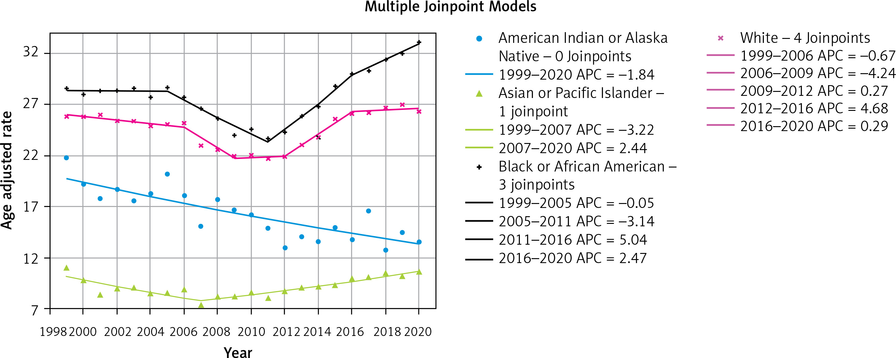 Black ancestry people had the highest AAMR (AAMR = 28.1; 95% CI: 27.9, 28.2) and the highest AAPC (AAPC = 0.71; 95% CI: 0.18, 1.25). The AAMR for Hispanic or Latino ancestry individuals was 14.1 (95% CI: 14.0, 14.2). The AAPC for Asian or Pacific islands ancestry individuals was 0.25 (95% CI: –0.43, 0.93). The AAPC for the White ancestry cohort was 0.12 (95% CI: –0.78, 1.04). Finally, the lowest AAPC (AAPC = –1.84; 95% CI: –2.42, –1.25) was observed among American Indians or the Alaska Natives ancestry group (Figure 5).