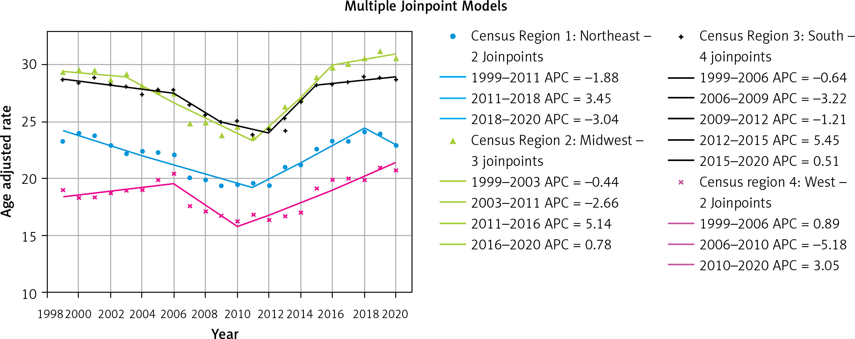 Trends of heart failure-related, age-adjusted mortality rate (per 100,000) stratified by census region in US, 1999 to 2020