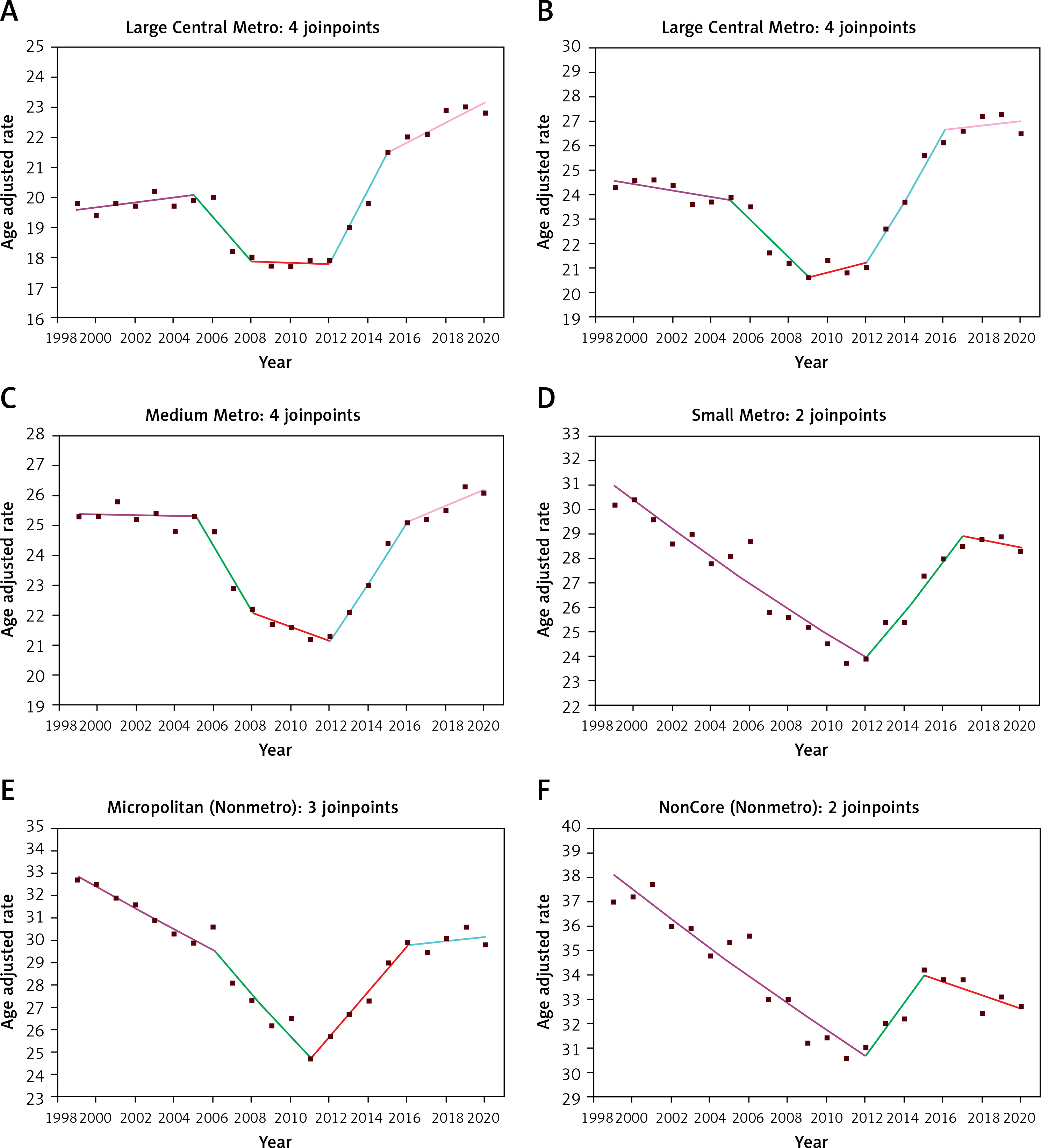 Trends of heart failure-related, age-adjusted mortality rate (per 100,000) stratified by Urban-Rural 2013 Classification Scheme in US, 1999 to 2020. Joinpoint regression model for urban–rural trends (2–4 segments). A – Large Central Metro – 1999 to 2005 (APC = 0.42; 95% CI: –0.32, 1.17), 2005 to 2008 (APC = –3.84; 95% CI: –8.12, 0.65), 2008 to 2012 (APC = –0.13; 95% CI: –2.53, 2.33), 2012 to 2015 (APC = 6.62; 95% CI:1.96, 11.50), and 2015 to 2020 (APC = 1.47; 95% CI: 0.60, 2.35). B – Large Fringe Metro – 1999 to 2005 (APC = –0.53; 95% CI: –1.47, 0.41), 2005 to 2009 (APC = –3.52; 95% CI: –6.39, –0.57), 2009 to 2012 (APC = 0.98; 95% CI: –5.26, 7.63), 2012 to 2016 (APC = 5.84; 95% CI: 2.92, 8.84), and 2016 to 2020 (APC = 0.33; 95% CI: –1.26, 1.94). C – Medium Metro – 1999 to 2005 (APC = –0.05; 95% CI: –0.67, 0.57), 2005 to 2008 (APC = –4.42; 95% CI: –8.05, –0.65), 2008 to 2012 (APC = –1.08; 95% CI: –3.18, 1.07), 2012 to 2016 (APC = 4.40; 95% CI: 2.35, 6.49), and 2016 to 2020 (APC = 1.06; 95% CI: –0.08, 2.2120). D – Small Metro – 1999 to 2012 (APC = –1.96; 95% CI: –2.40, –1.53), 2012 to 2017 (APC = 3.87; 95% CI: 1.44, 6.35), 2017 to 2020 (APC = –0.52; 95% CI: –3.93, 3.01). E – Micropolitan – 1999 to 2006 (APC = –1.48; 95% CI: –2.07, –0.89), 2006 to 2011 (APC = –3.47; 95% CI: –4.65, –2.28), 2011 to 2016 (APC = 3.75; 95% CI: 2.48, 5.02), and 2016 to 2020 (APC = 0.31; 95% CI: –0.81, 1.44). F – NonCore – 1999 to 2012 (APC = –1.65; 95% CI: –2.00, –1.29), 2012 to 2015 (APC = 3.42; 95% CI: –3.84, 11.23), and 2015 to 2020 (APC = –0.80; 95% CI: –2.35, 0.77)