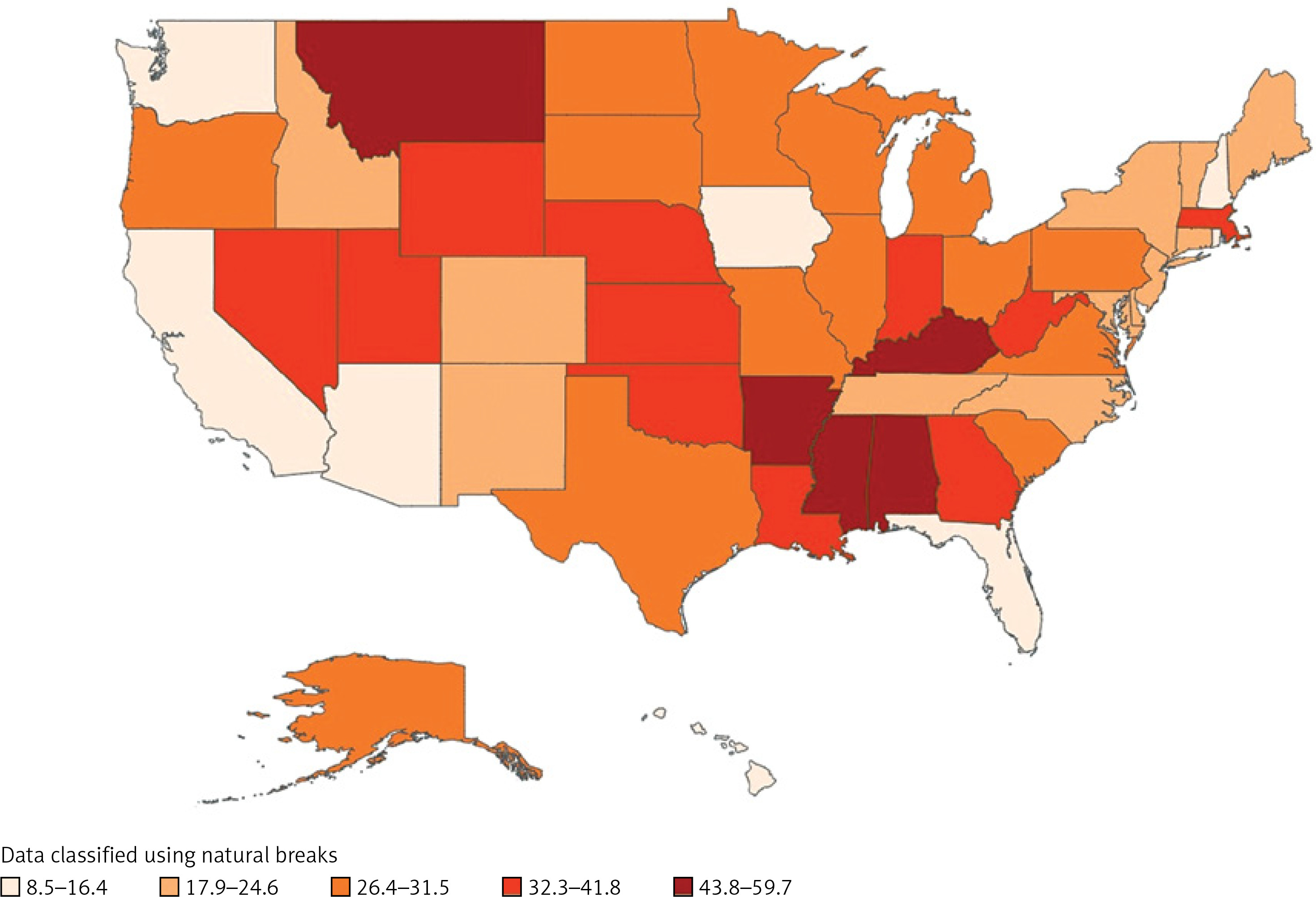 The non-metropolitan NonCore (AAMR = 33.7; 95% CI: 33.5, 33.9) had the highest AAMR, followed by the non-metropolitan Micropolitan (AAMR = 29.1; 95% CI: 28.9, 29.2). The largest AAPC was found in large Central Metro counties (AAPC = 0.80; 95% CI: –0.11, 1.72). With an AAPC of –0.74 (95% CI: –1.76, 0.29), NonCore (Nonmetro) had the lowest AAPC; the difference was not statistically significant. Based on the data presented in Figure 7, the AAPC values for the Large Fringe Metro were 0.45 (95% CI: –0.63, 1.54), Medium Metro was 0.15 (95% CI: –0.55, 0.87), Small Metro was –0.40 (95% CI: –1.12, 0.33), and Micropolitan (Nonmetro) was –0.40 (95% CI: –0.85, 0.05). With an AAMR of 58.0 (95% CI: 57.3, 58.7), Mississippi had the highest mortality rate, followed by AAMRs of 55.5 (95% CI: 55.0, 56.0) in Alabama and 44.5 (95% CI: 44.0, 45.0) in Louisiana (Figure 8).