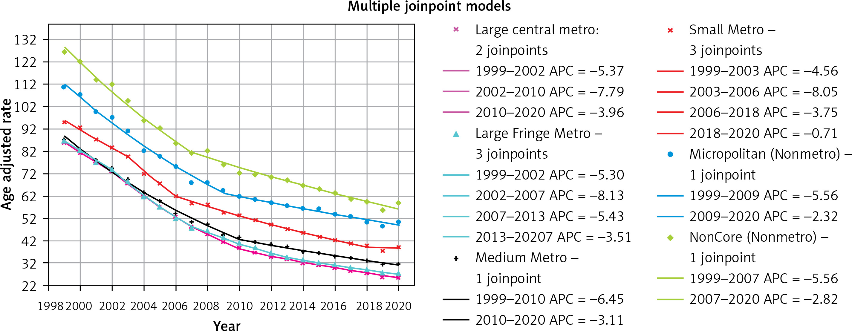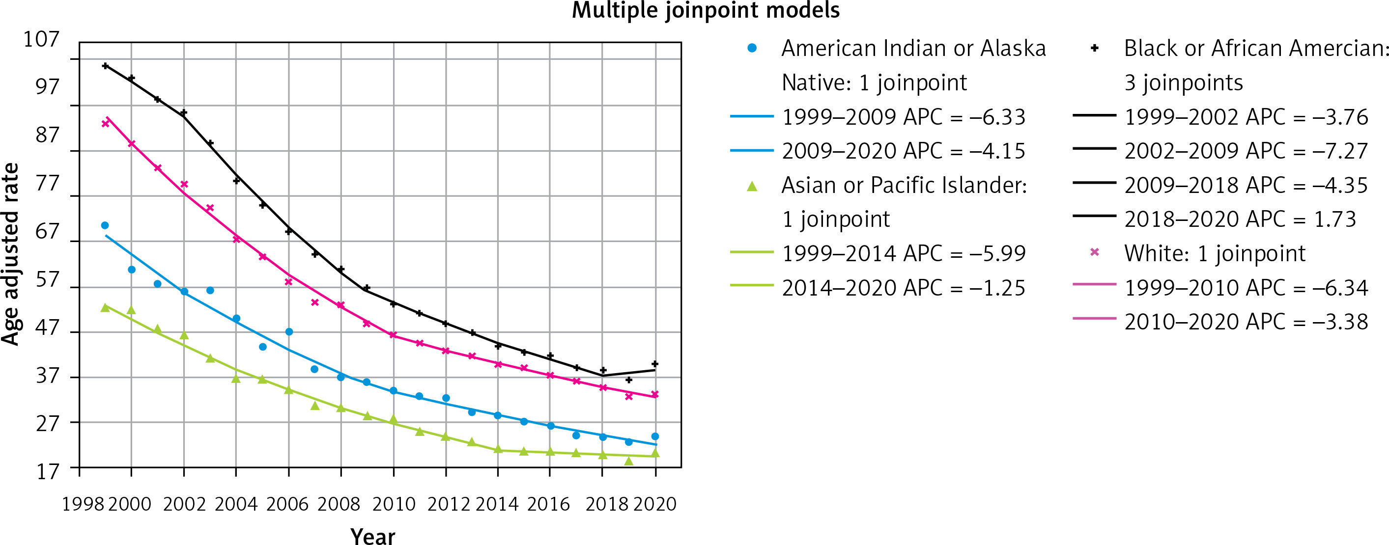 Between 1999 and 2020, 3,016,546 AMI-related deaths were reported in the US. Out of all the deaths, 1,095,331 (36.3%) occurred in inpatient medical facilities, 745,049 (24.7%) occurred in the descendant’s home and the remaining deaths occurred in other locations. The AAMR between 1999 and 2020 was 51.9 per 100,000 (95% CI: 51.8–52.0). Regarding the mortality trend, there was an overall average annual percent change (AAPC) of –5.01% (95% CI: –5.27, –4.76) with the AAMR decreasing from 93.2 (95% CI: 92.8, 93.6) in 1999 to 33.4 (95% CI: 33.2, 33.6) in 2020. From 1999 to 2010, there was a notable and steeper decline in AAMR (APC = –6.43; 95% CI: –6.74, –6.11) which was followed by a slower decline from 2010 to 2020 (APC = –3.43; 95% CI: –3.89, –2.96), as demonstrated in Table I and Figure 1.