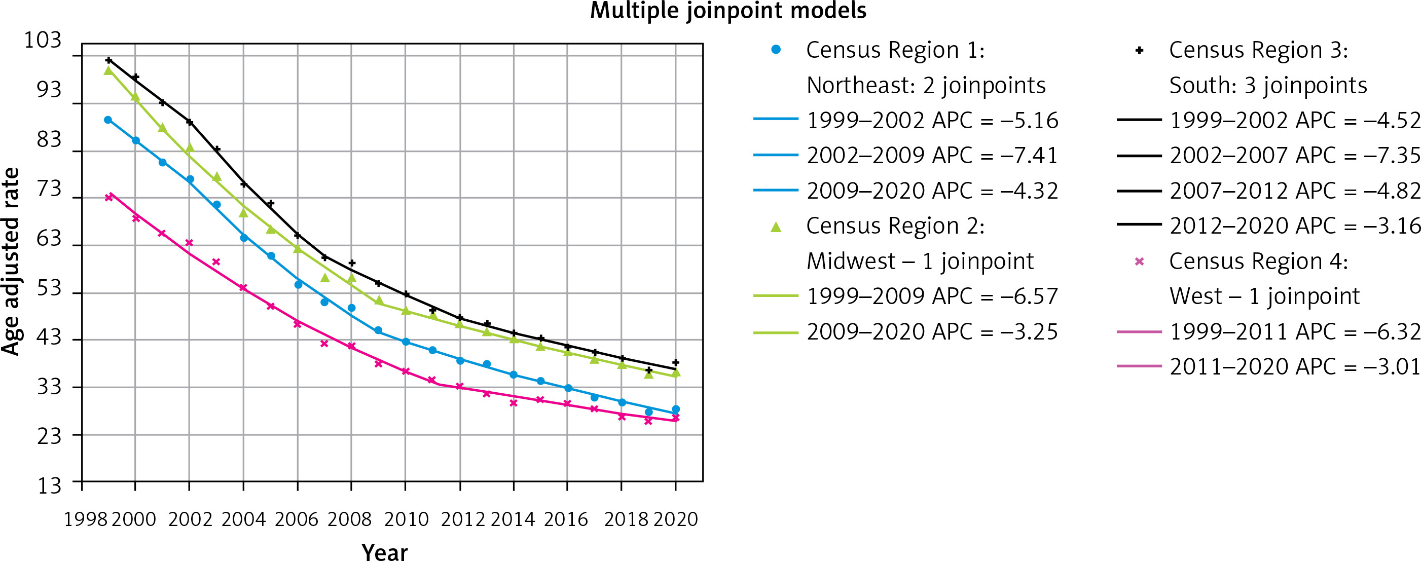 The South region of the US had the highest AAMR from 1999 to 2020 (57.7; 95% CI: 57.6, 57.8), whereas the West region had the lowest AAMR (40.3; 95% CI: 40.2, 40.4). All regions had a downward trending mortality rate, with the Northeast region having the most negative AAPC (–5.48; 95% CI: –5.90, –-5.06) and the South region having the least negative AAPC (–4.76; 95% CI: –5.28, –4.24) (Figure 4).