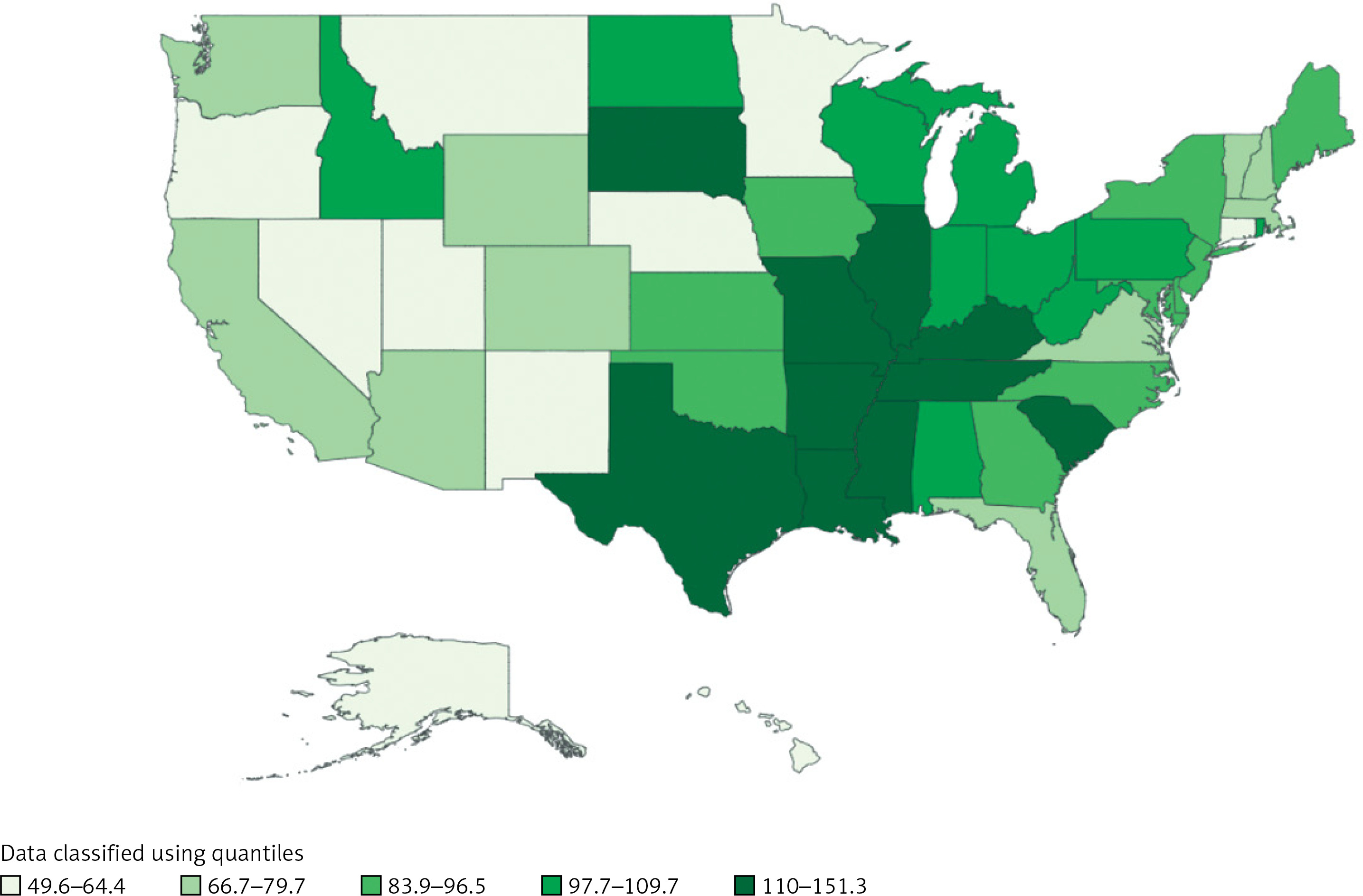 Delving deeper into specific states, AAMR from 1999 to 2020 was highest in Kentucky (87.7; 95% CI: 87.0, 88.3), followed by Mississippi (85.8; 95% CI: 85.0, 86.6) and Missouri (80.3; 95% CI: 79.8–80.8) (Figure 6).