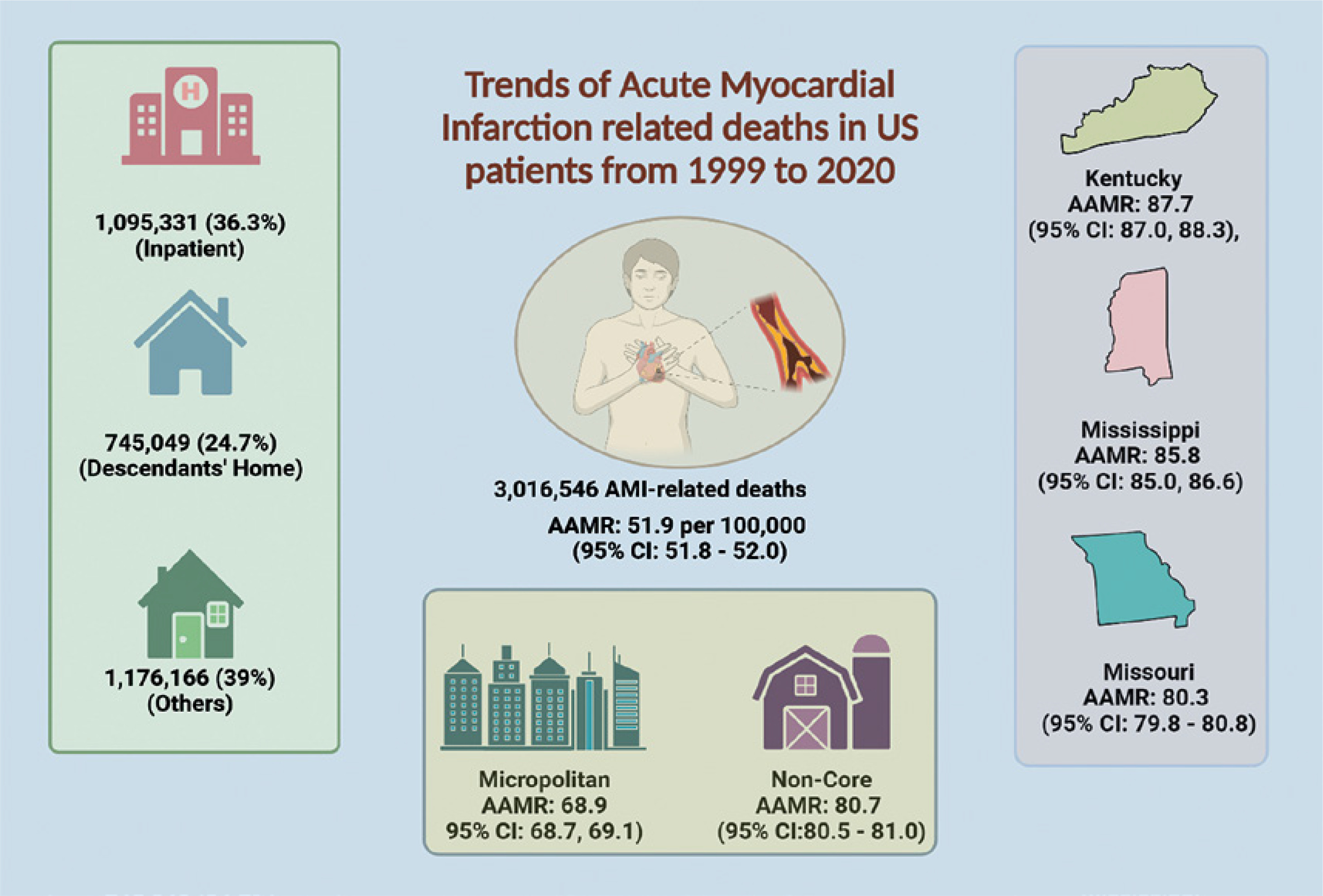 Central illustration highlighting overall AMI-related deaths, stratified by setting, as well as the AAMR with geographical stratification between 1999 and 2020