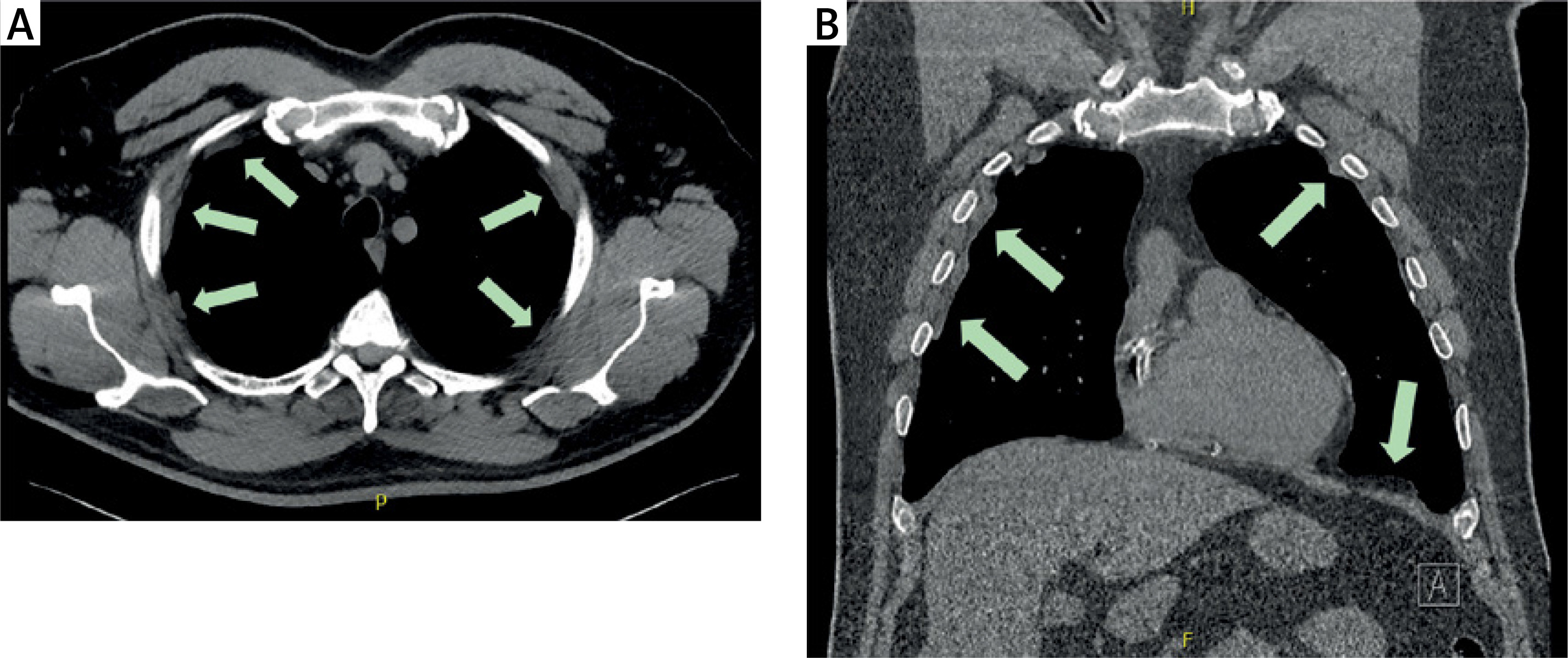 Computed tomography (CT) scan images showing calcified plaques in the parietal pleura (arrows). A – Transverse plane scan of the thoracic cavity. B – Coronal reconstruction highlighting the distribution of pleural plaques