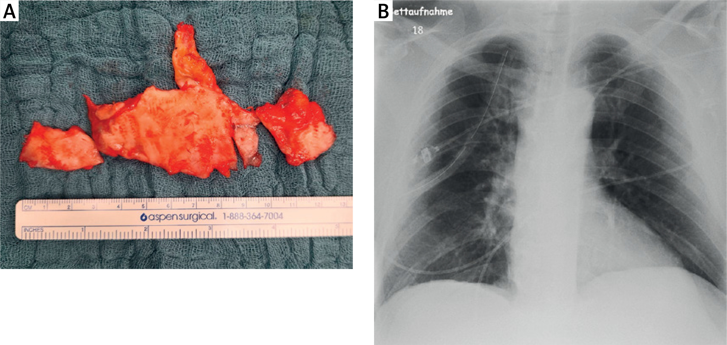 A – A section of the parietal pleura with representative calcified plaques, resected for histological examination. B – Postoperative chest X-ray showing no evidence of pneumothorax or hemothorax